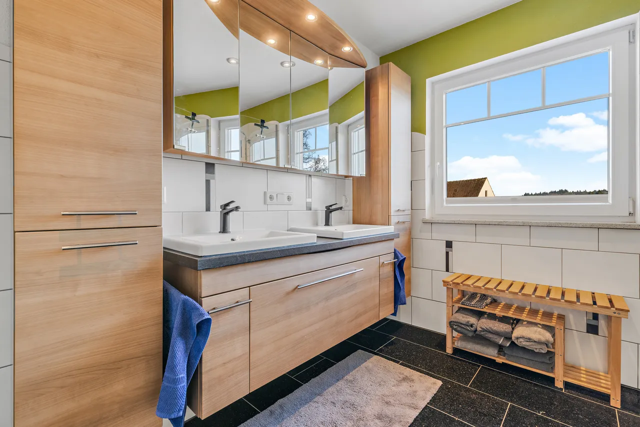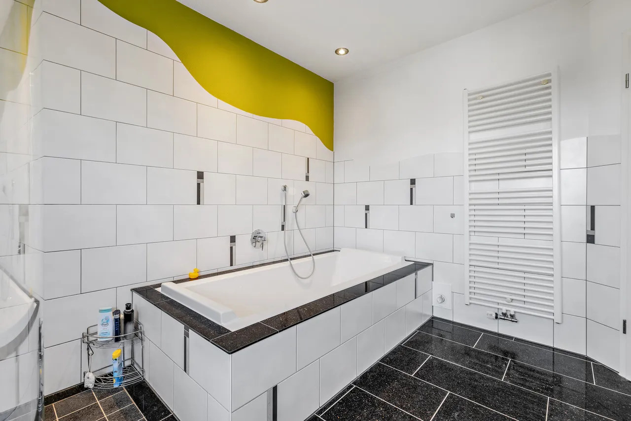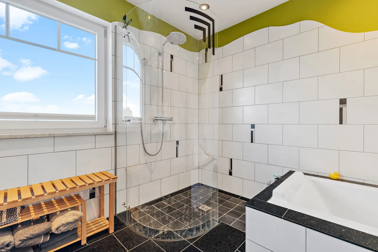 + Das Haupt-Badezimmer verfügt über eine Badewanne und eine Dusche - hier ist auch eine Fußbodenheizung verlegt.