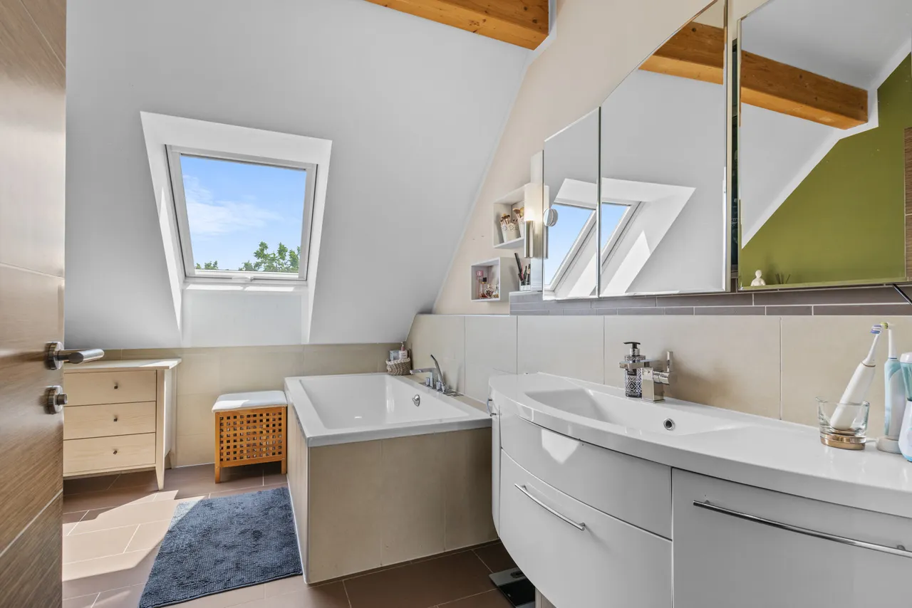 + Das Badezimmer im Dachgeschoss verfügt über eine Badewanne, eine Dusche, ein WC und einen Waschtisch.