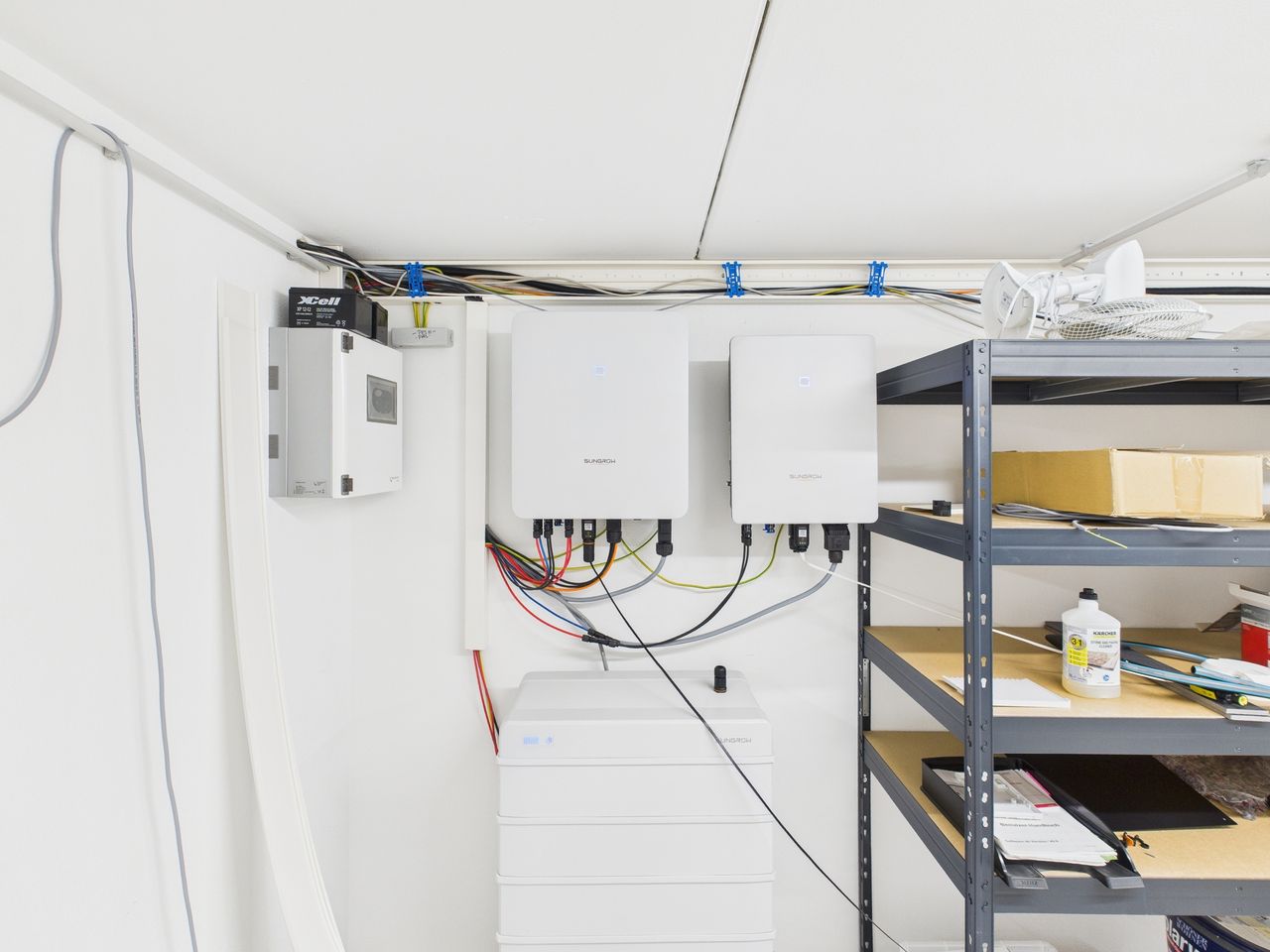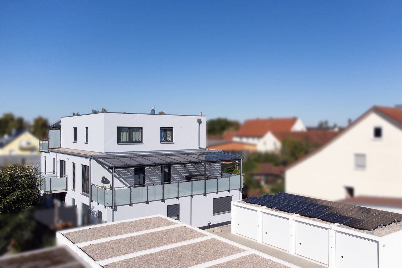 Sehr selten: Die Photovoltaikmodule auf den Garagen, der Balkonüberdachung und der Hälfte des Hausdaches sind Eigentum des Erwerbers - die gesamte produzierte Energie steht dem künftigen Eigentümer zu (Leistung 16,6 kWp). Ergänzt wird die Photovoltaikanlage durch einen Batteriespeicher im Keller (19,20 kWh) - das Smart-Home System des renommierten Herstellers LOXONE ermöglicht zudem auf Wunsch auch ein intelligentes Energiemanagement. Auch bei hohen Stromverbräuchen ist hier - unter Berücksichtigung der Einspeisevergütung für die erzeugten Überschüsse - ein autarker Stromverbrauch möglich.