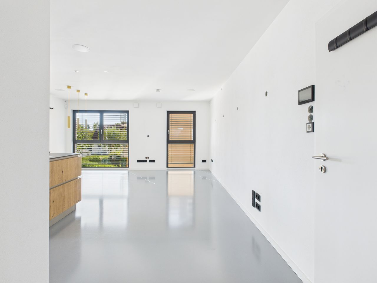 + Im Wohn- und Schlafbereich wurde ein hellgrauer, fugenloser Bodenbelag verlegt.