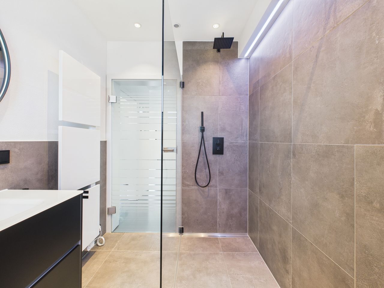 + Das Badezimmer ist mit einem großen Waschtisch, einem WC und einer großen, begehbaren Dusche ausgestattet.