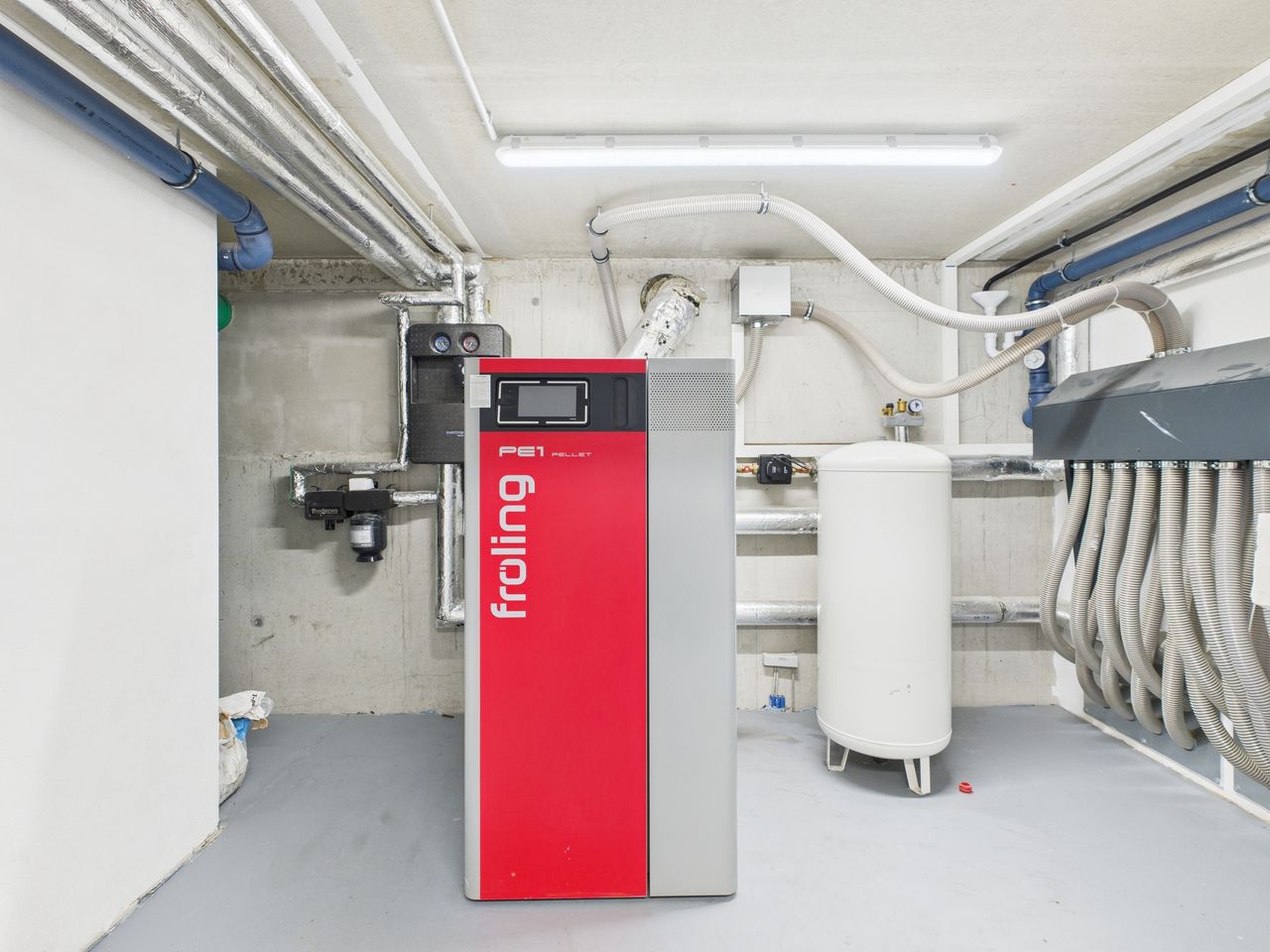Die Wohnanlage wird über eine Fröling-Holzpellets-Zentralheizung beheizt, ausgeführt als Fußbodenheizung. Im Badezimmer ist ein zusätzlicher Handtuchheizkörper vorhanden. Eine JUDO Enthärtungsanlage sorgt für weiches Wasser und weniger Reinigungsaufwand, insbesondere in den Sanitärbereichen.