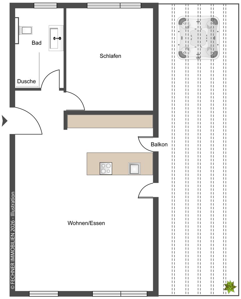 Insgesamt bietet die Wohnung verteilt auf 2-Zimmer eine Wohnfläche von 63,35 m². Der große Balkon ist hierbei nur anteilig mit 8,10 m² berücksichtigt. Besonders viel Privatsphäre bietet ein vertikales, elektrisches Frontrollo aus Stoff. Dieses kann über die gesamte Balkonbreite elektrisch heruntergelassen werden. Eine Wetterstation schützt das Rollo - beispielsweise vor Sturmschäden.