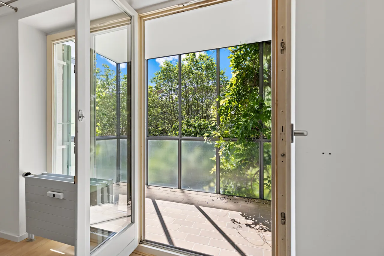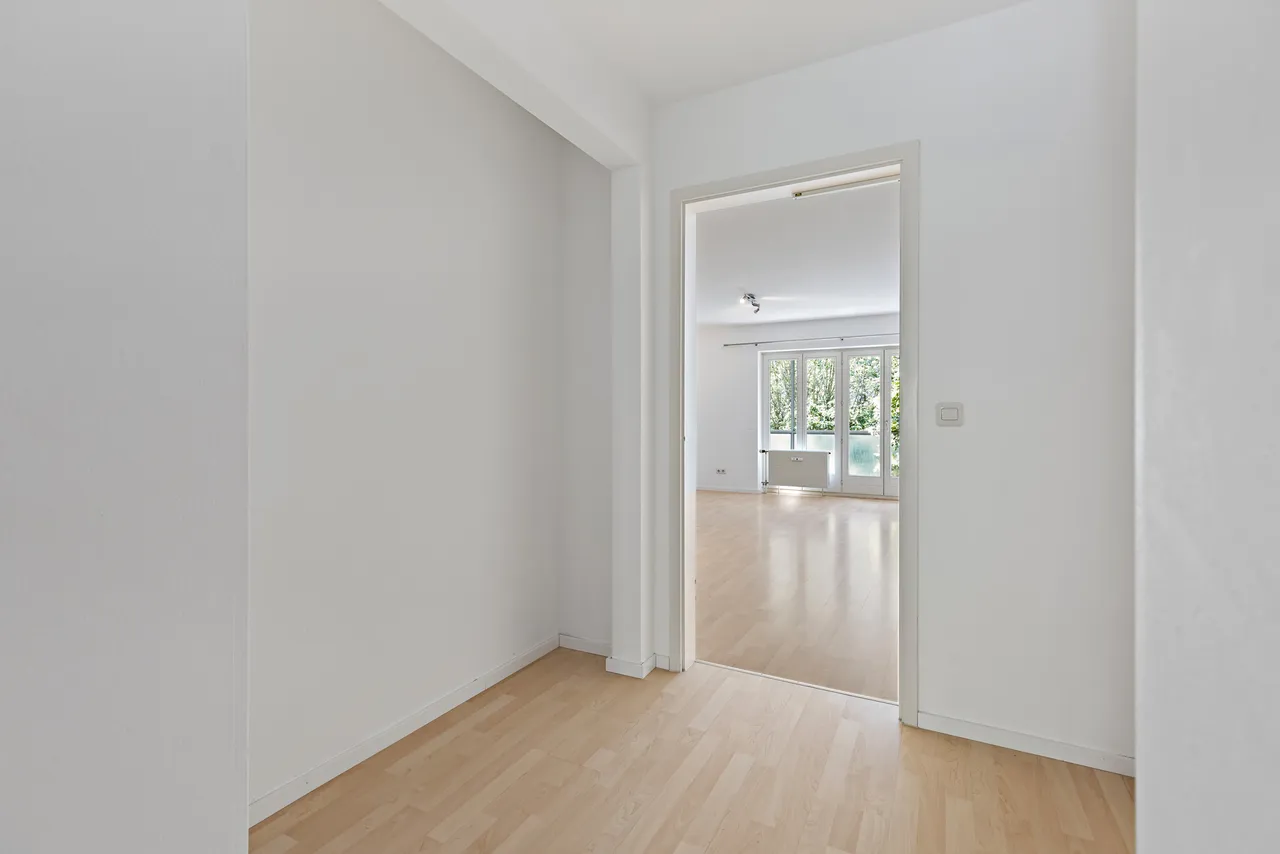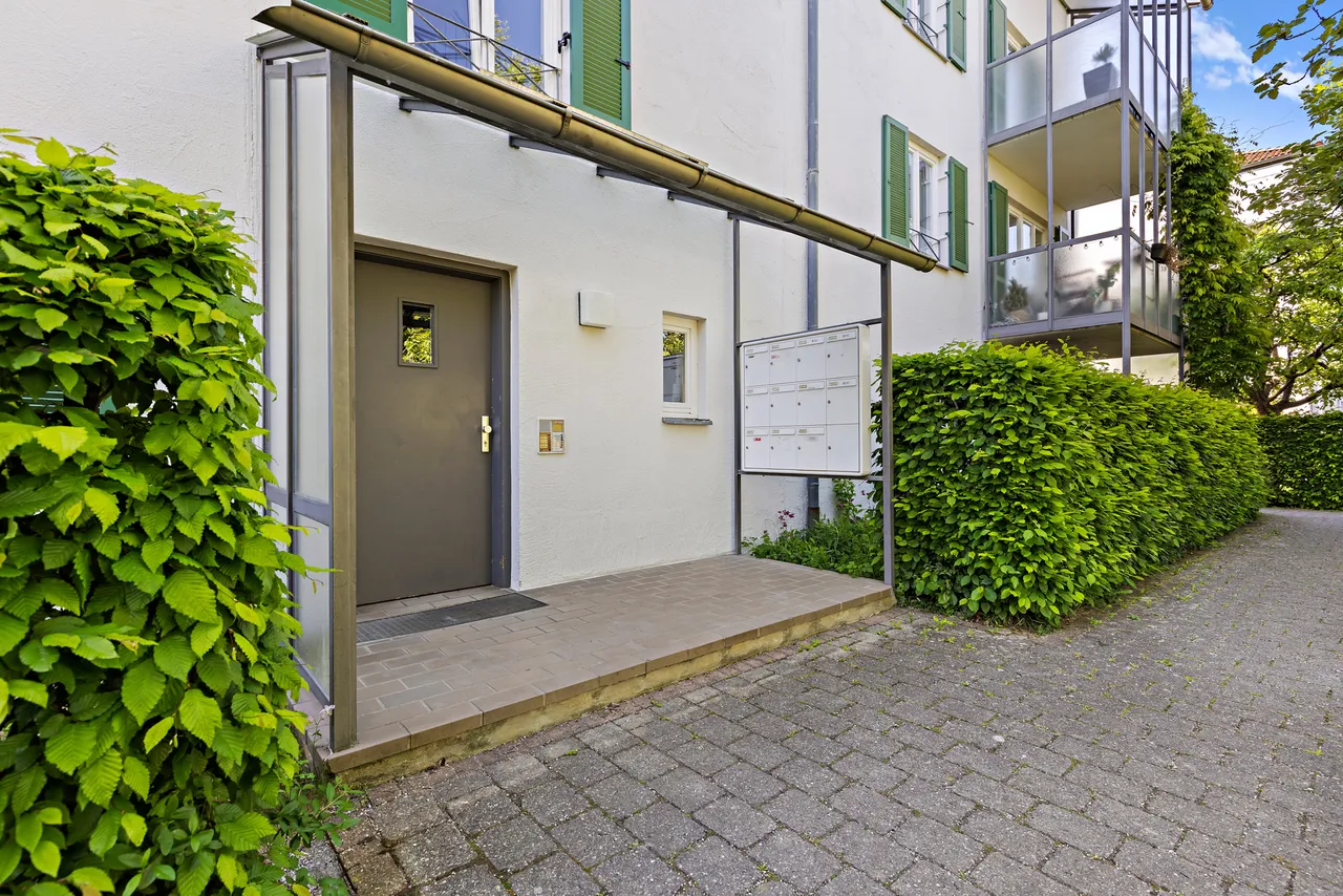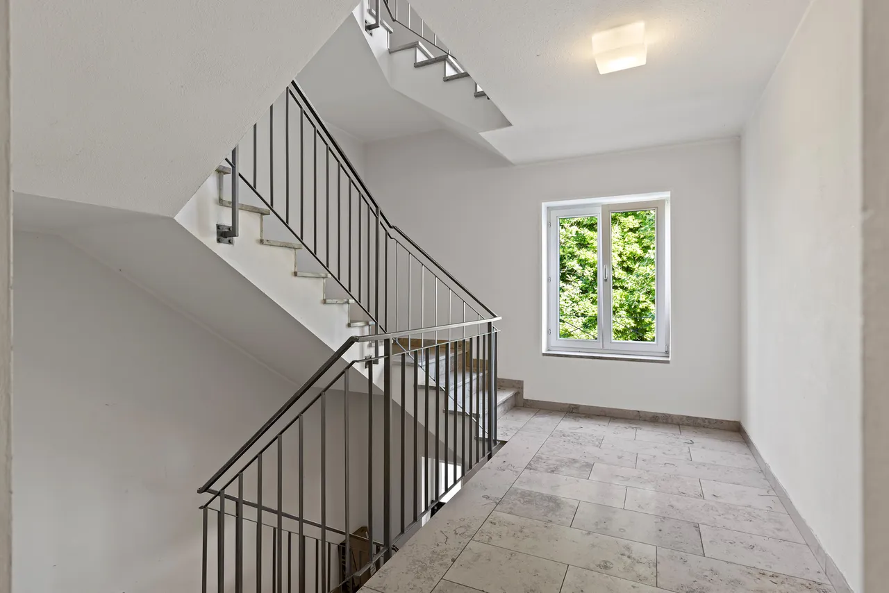 Innerhalb des Mehrfamilienhauses befindet sich die Wohnung im 1. Obergeschoss - das Wohnzimmer und der Balkon sind nach Westen ausgerichtet, das Schlafzimmer nach Osten.