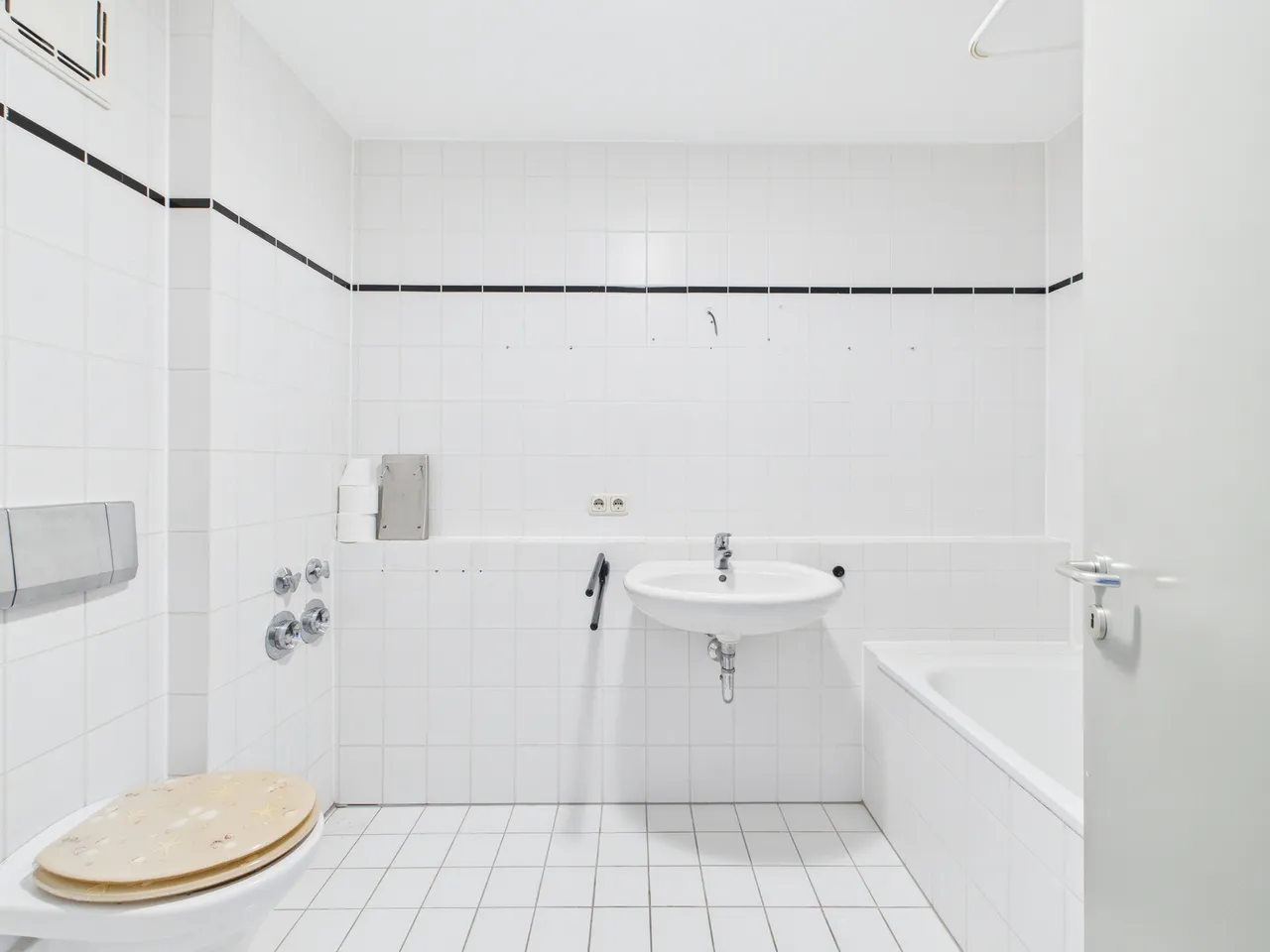 + Badezimmer innenliegend mit Badewanne, Waschbecken, WC und Waschmaschinen-Anschluss, hell gefliest.