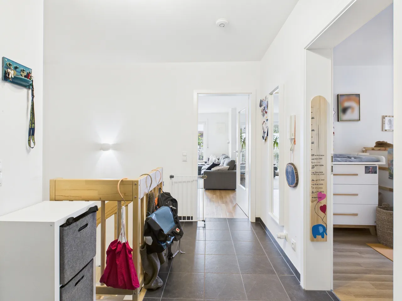 In allen Wohn- und Schlafräumen ist ein pflegeleichter Vinylbodenbelag in Holzparkettoptik verlegt. Das Bad und der Eingangsbereich sind dunkel gefliest.