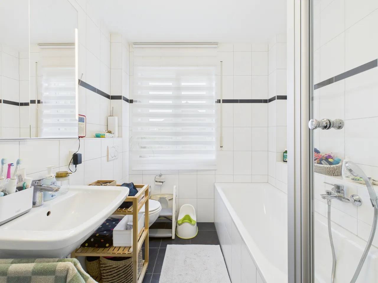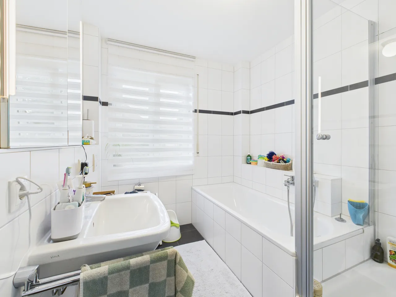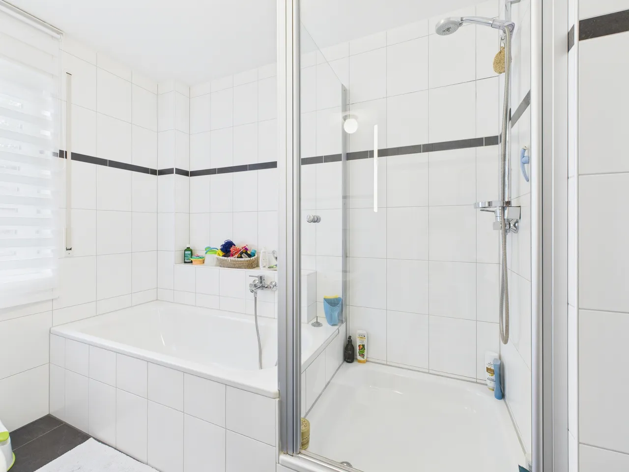 Das Bad verfügt über ein Fenster. Eine Badewanne und eine Dusche sind vorhanden.