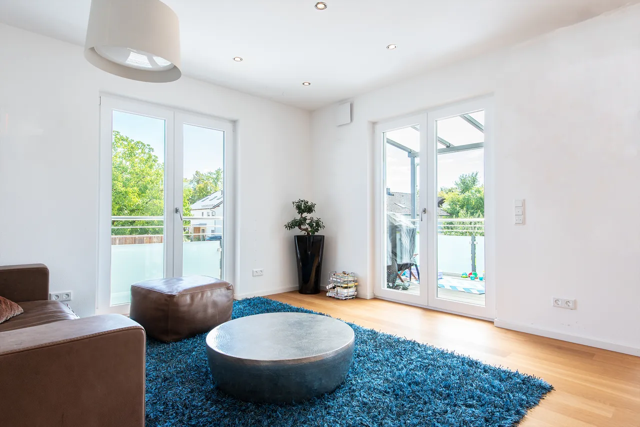 Vermietet wird eine hochwertig ausgestattete 3-Zimmerwohnung im 1. Obergeschoss mit überdachtem Balkon in Südwestausrichtung mit ca. 7,63m² Nutzfläche.