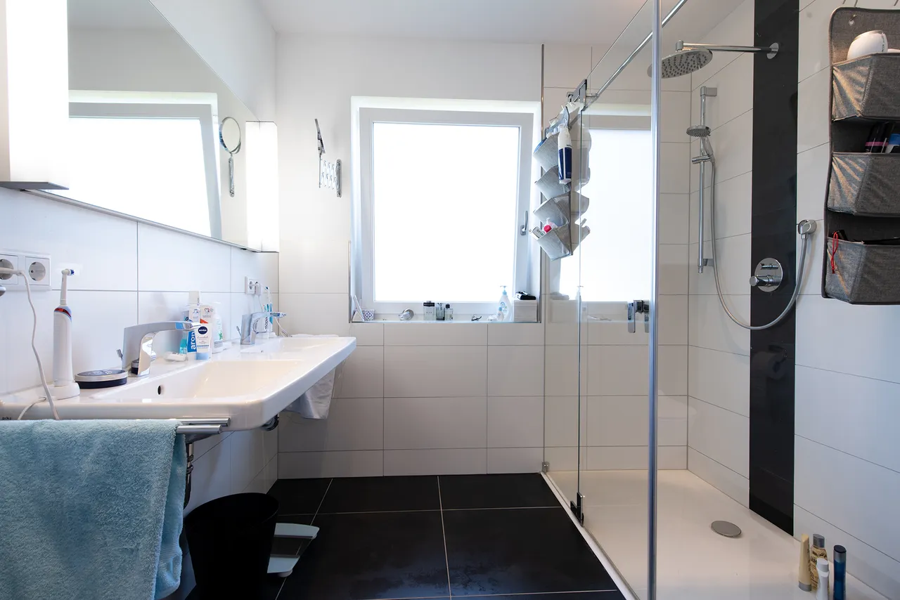 Bad: Wände halbhoch hell in weiß gefliest, Nassbereiche raumhoch, Boden tiefschwarz gefliest - mit großer Dusche und Klarglaskabine. Ein zusätzlicher Handtuchheizkörper ist installiert. Ebenfalls vorhanden ist ein großer Doppelwaschtisch mit beleuchtetem Spiegel.