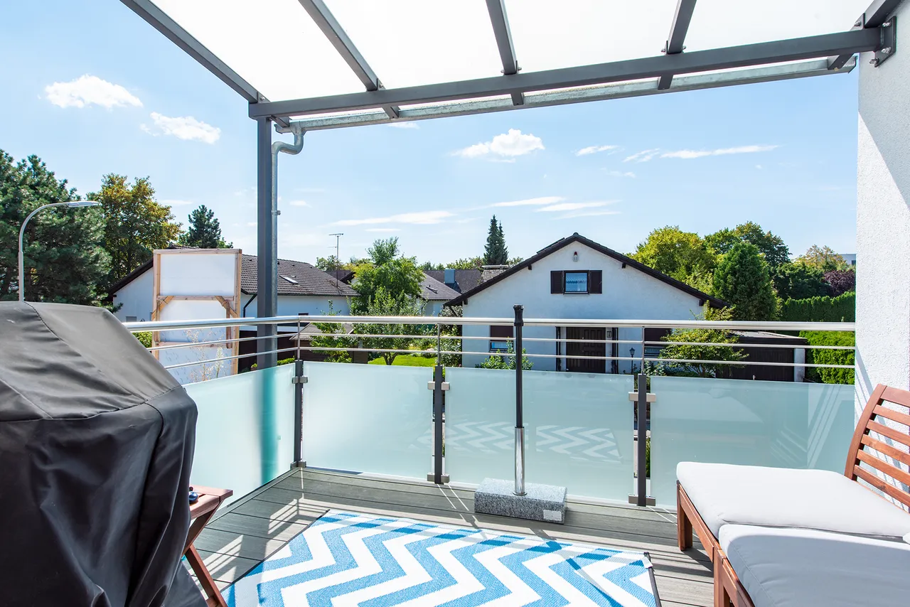 Balkon: Unempfindlicher Balkonbelag in Holzdielen-Optik (WPC Wood-Plastic-Composite, Holz-Kunststoffgemsich), Sichtschutz aus Glas, satiniert, mit Edelstahl-Brüstung und Glas-Überdachung