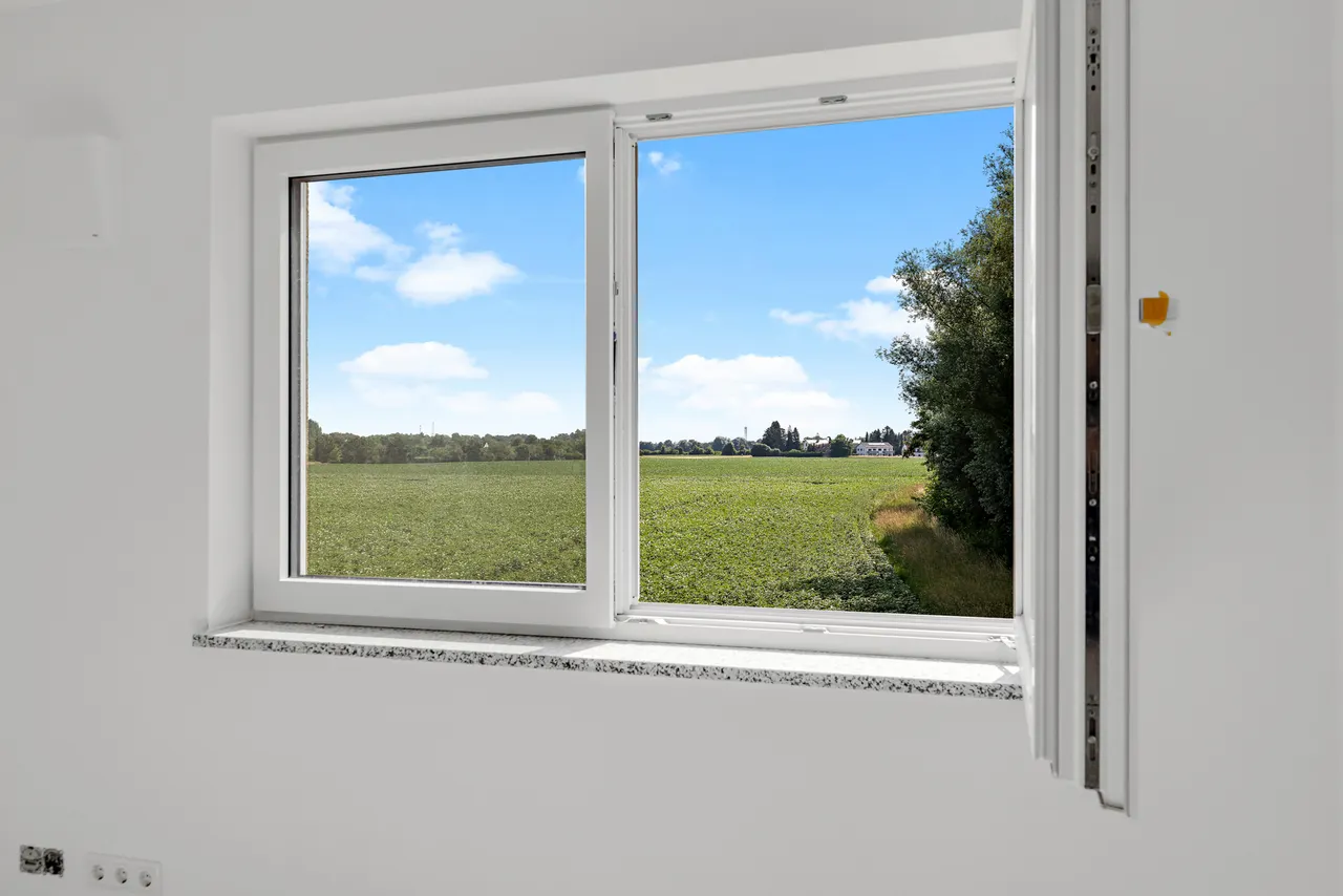 + Kunststofffenster mit verdeckt liegenden Beschlägen und 3-Scheiben-Isolierverglasung - energieeffizient und pflegeleicht.