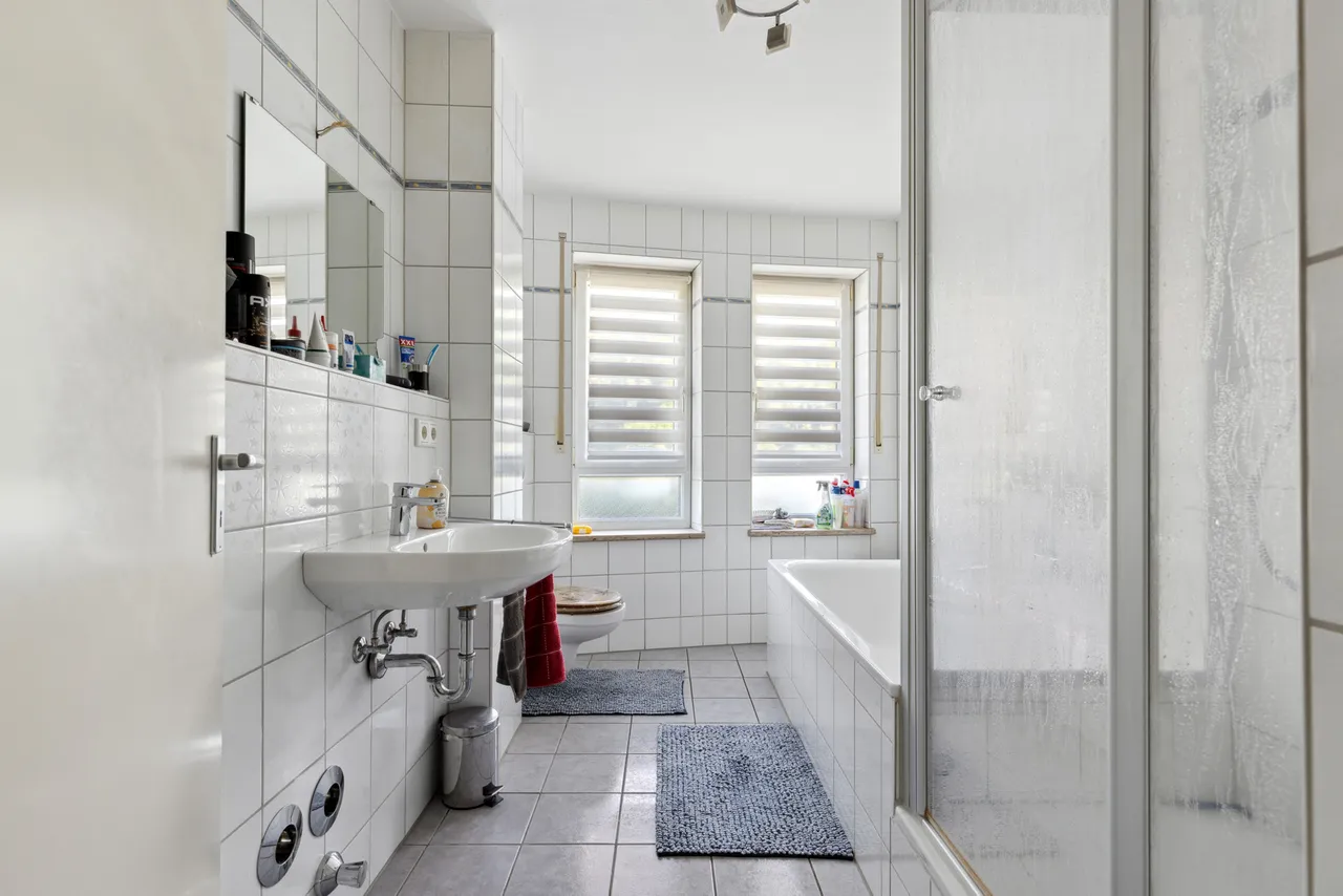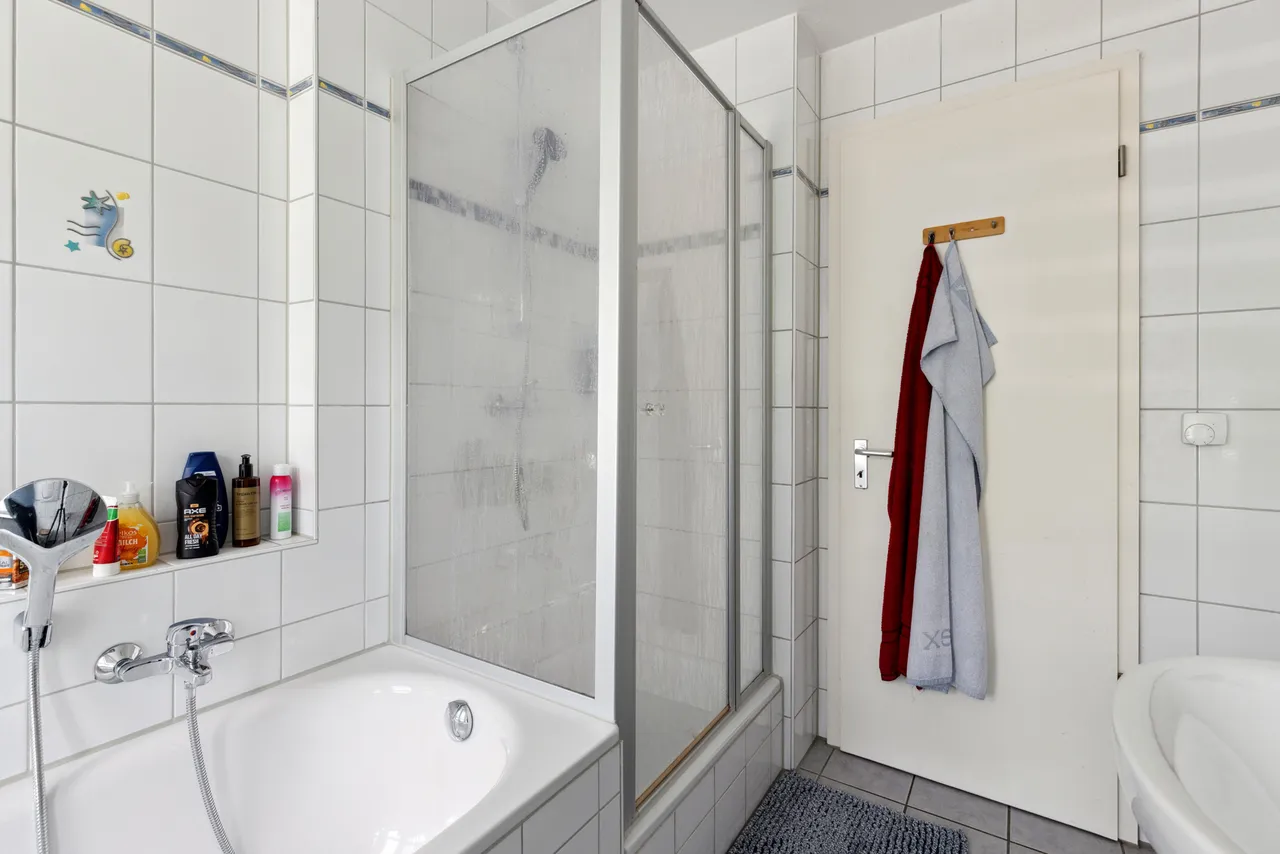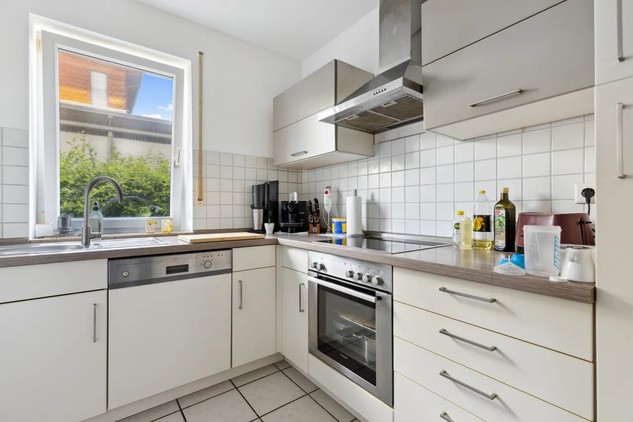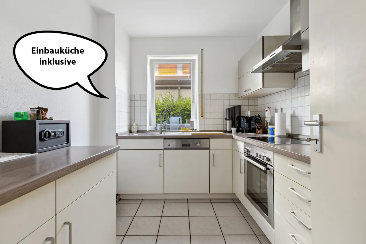 Im Badezimmer befinden sich zwei Fenster - die Sanitärausstattung umfasst eine Badewanne, eine Dusche, ein WC und ein Waschbecken. Die auf den Fotos ersichtliche Einbauküche ist inklusive der verbauten Elektro-Großgeräte (Geschirrspüler, Backofen, Herd, Kühlschrank) bereits im Kaufpreis enthalten.