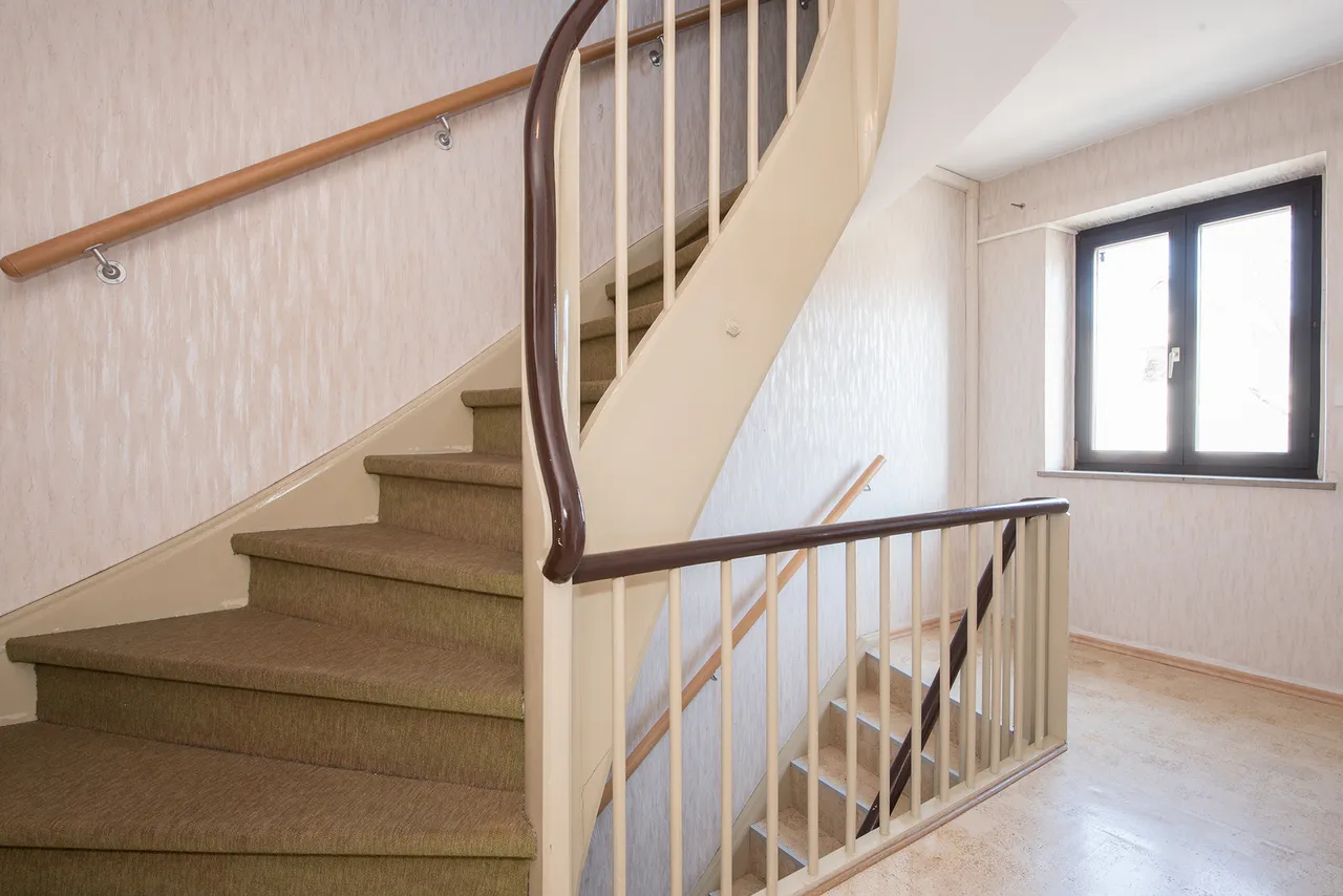 Besonders das Erhalten alter Elemente im Gebäude (sehr schönes Treppenhaus, alte Dielenböden, Teil-Freilegung des 38cm starken Ziegel-Mauerwerks etc.) schafft eine besonders wohnliche Atmosphäre.