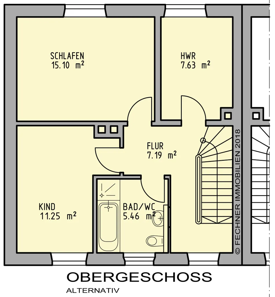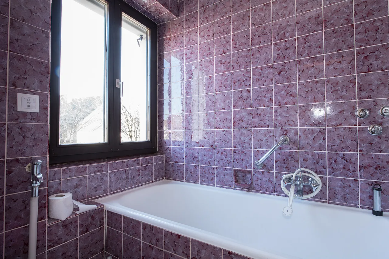 Das Bad und das Gäste WC entsprechen einem älteren Baujahr, sind funktionell aber aus optischen Gründen nicht erhaltungswürdig. Ebenso empfiehlt sich im 1. OG die Vergrößerung des Badezimmers. Ein Gestaltungsbeispiel der Grundrissänderung finden Sie in unserem Exposé.