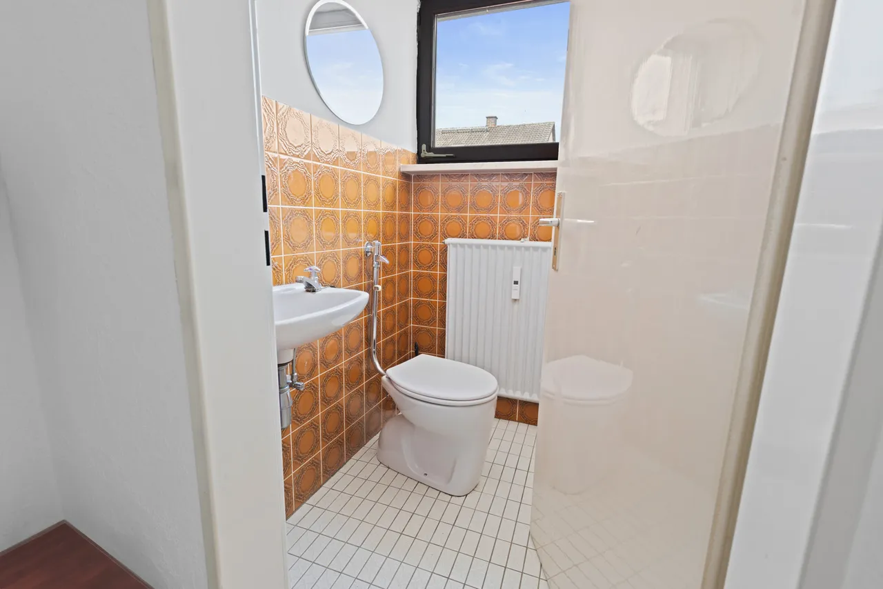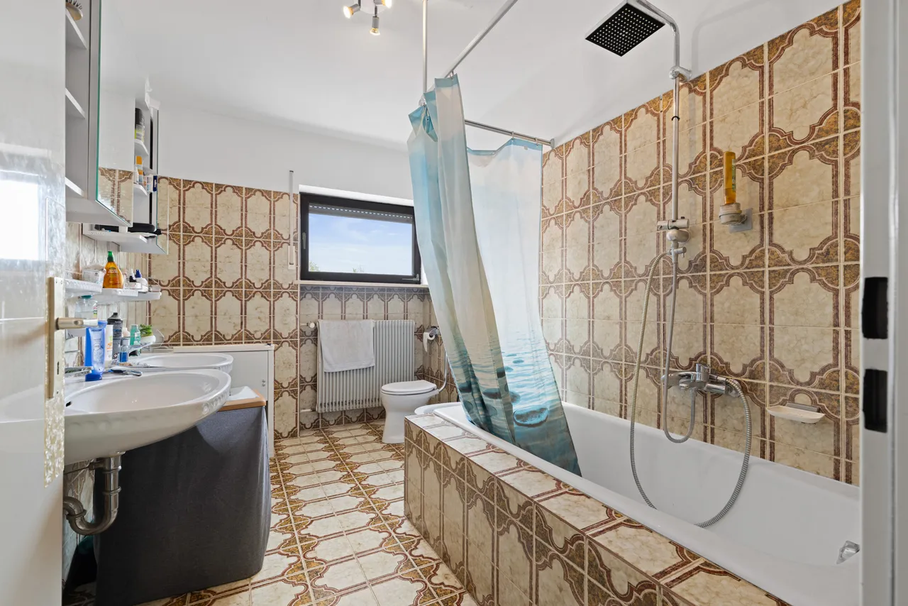 Das Badezimmer ist mit zwei Waschbecken, einem WC, einem Bidet und einer Badewanne ausgestattet. Ein Tageslichtfenster ist vorhanden - die Fliesen entsprechen dem Ursprungsbaujahr. Ein separates Gäste-WC ist ebenso vorhanden.