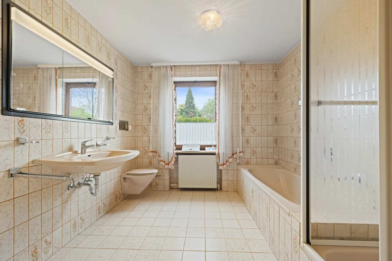 + altes Badezimmer mit Badewanne, Dusche, WC, Waschbecken und Tageslichtfenster