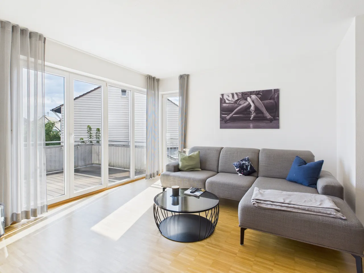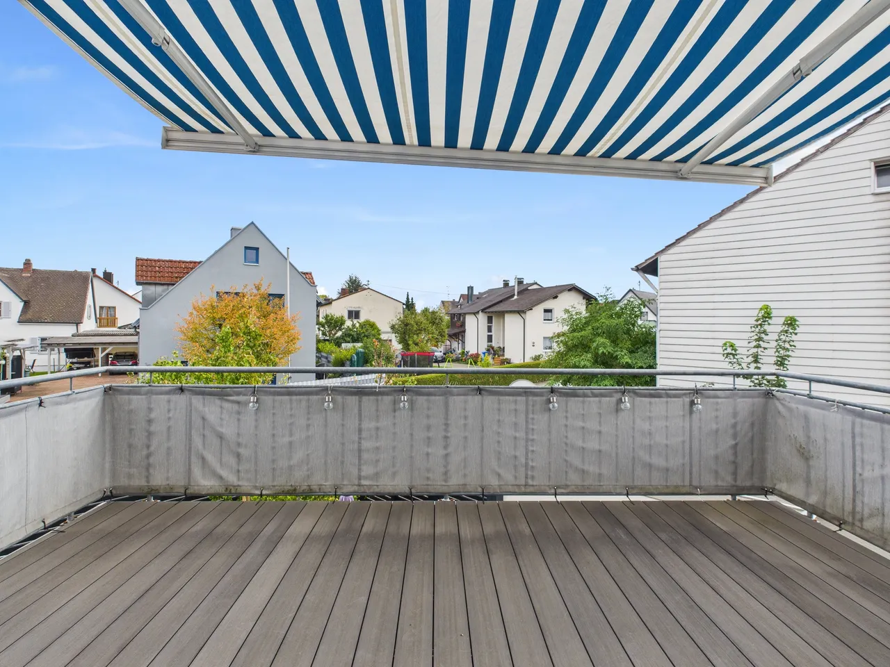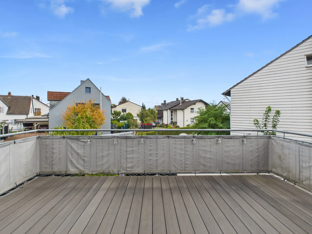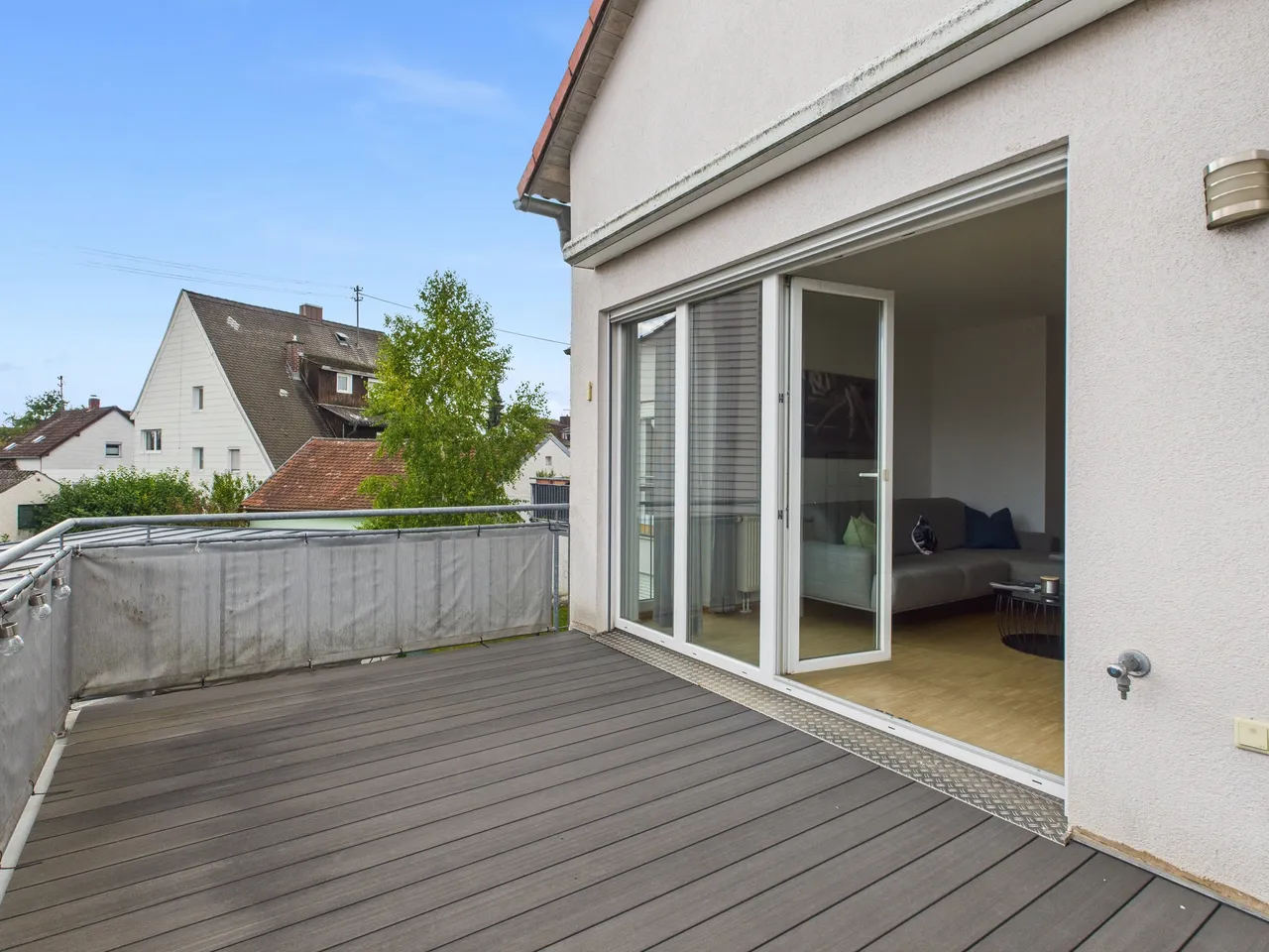 + Der Balkon verfügt über einen pflegeleichten WPC-Bodenbelag.