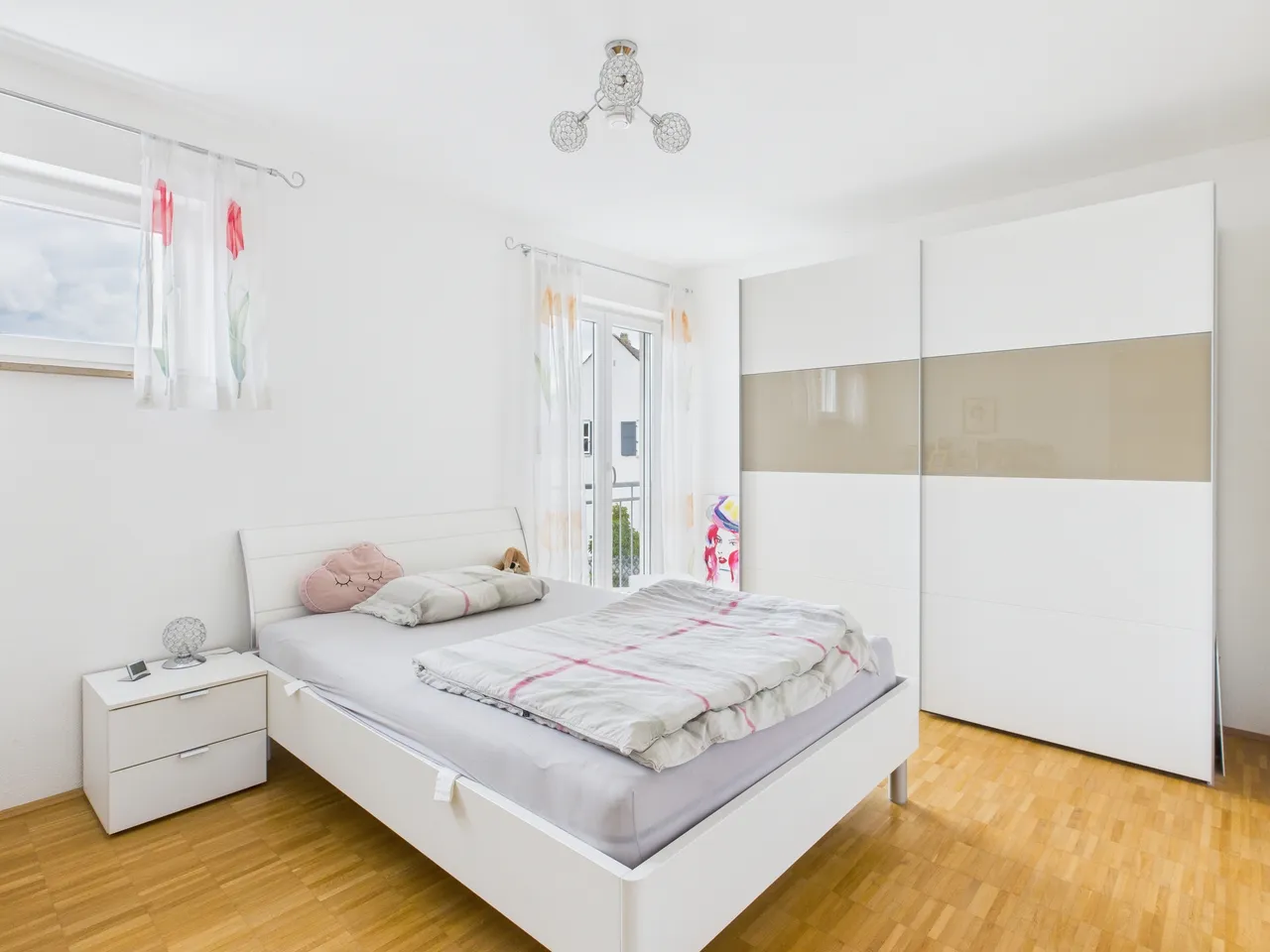 + In den Wohn- und Schlafräumen wurde ein Stäbchenparkett-Bodenbelag verlegt.
