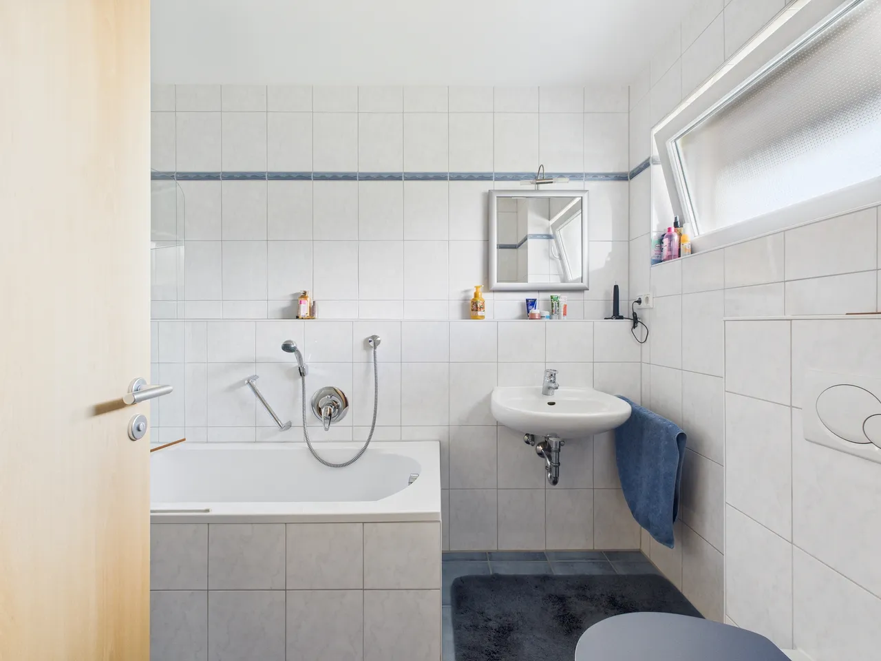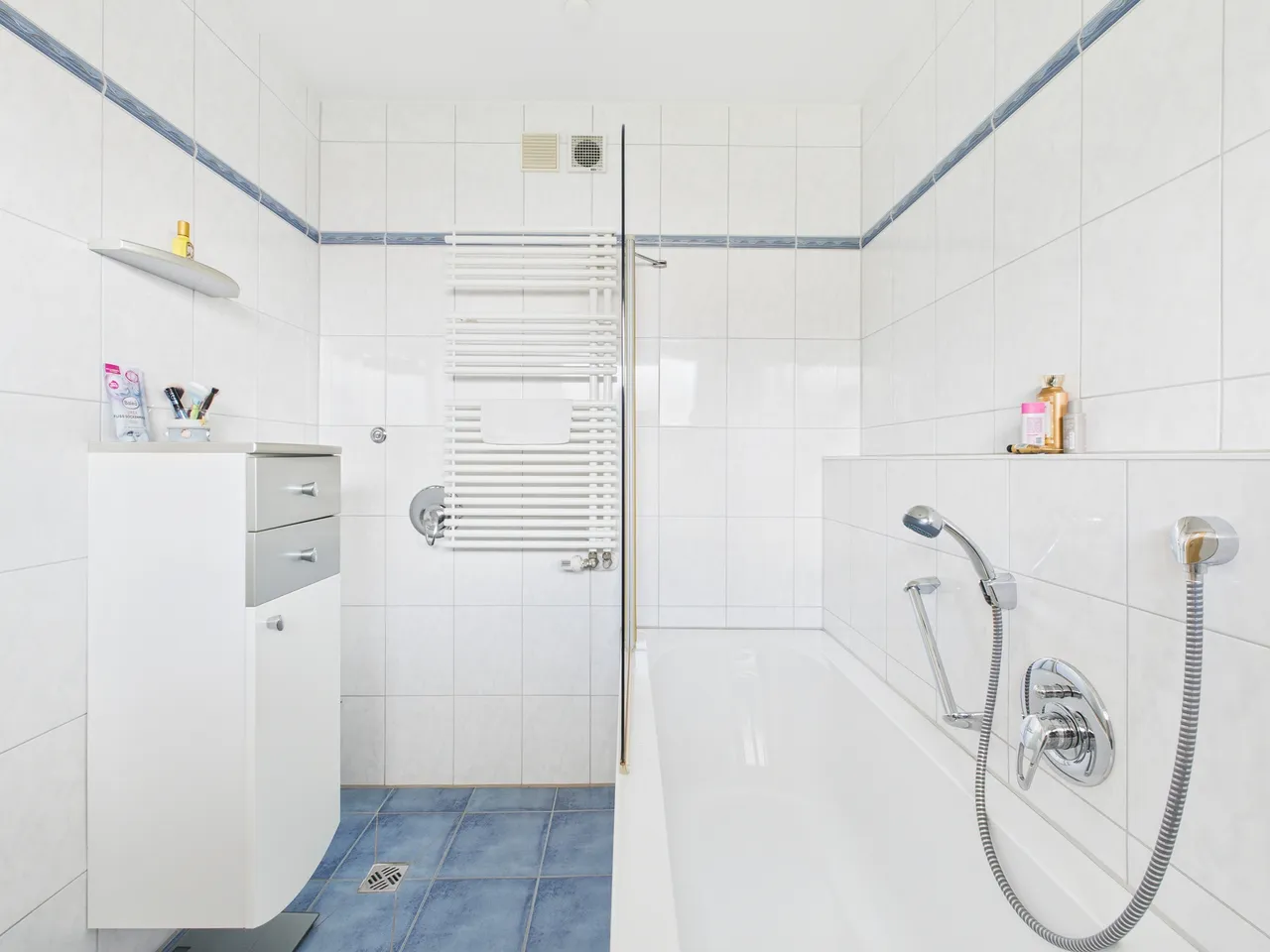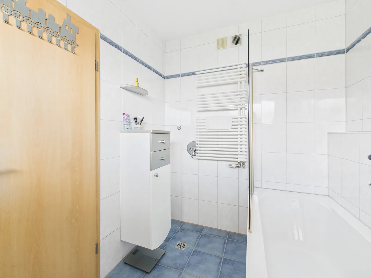 Das Badezimmer verfügt über eine Badewanne mit Duschabtrennung, ein WC, ein Waschbecken und ein Fenster. Ein Handtuchheizkörper ist vorhanden. Im Bereich des Handtuchheizkörpers sind bereits Anschlüsse für die Installation einer Dusche vorbereitet.