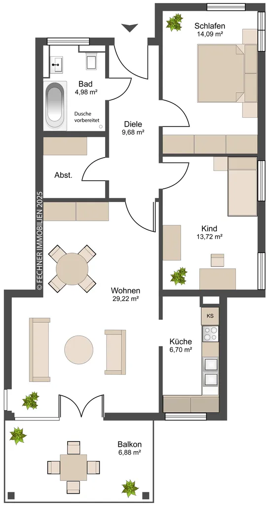 Die Südost-Ausrichtung des Balkons sorgt für sonnige Stunden am Morgen bis zum Nachmittag.