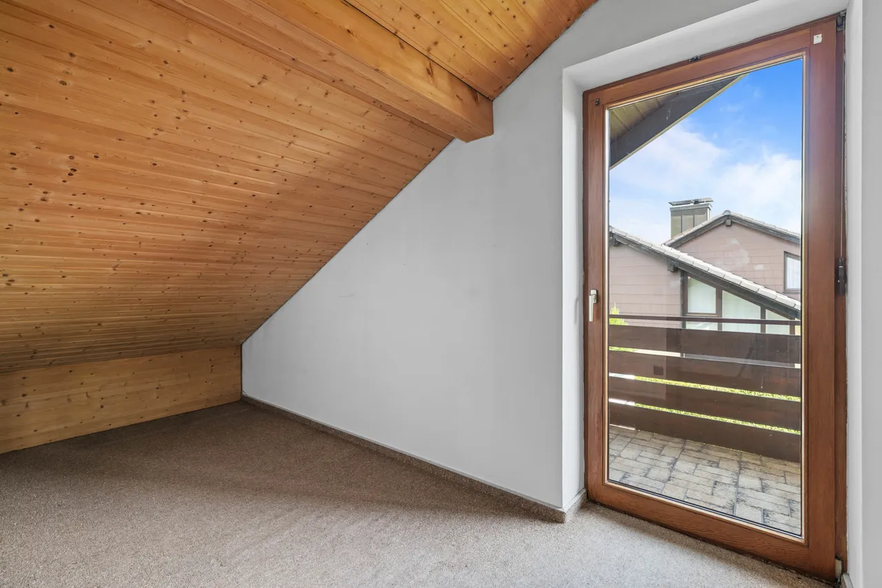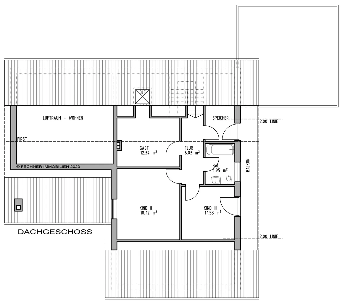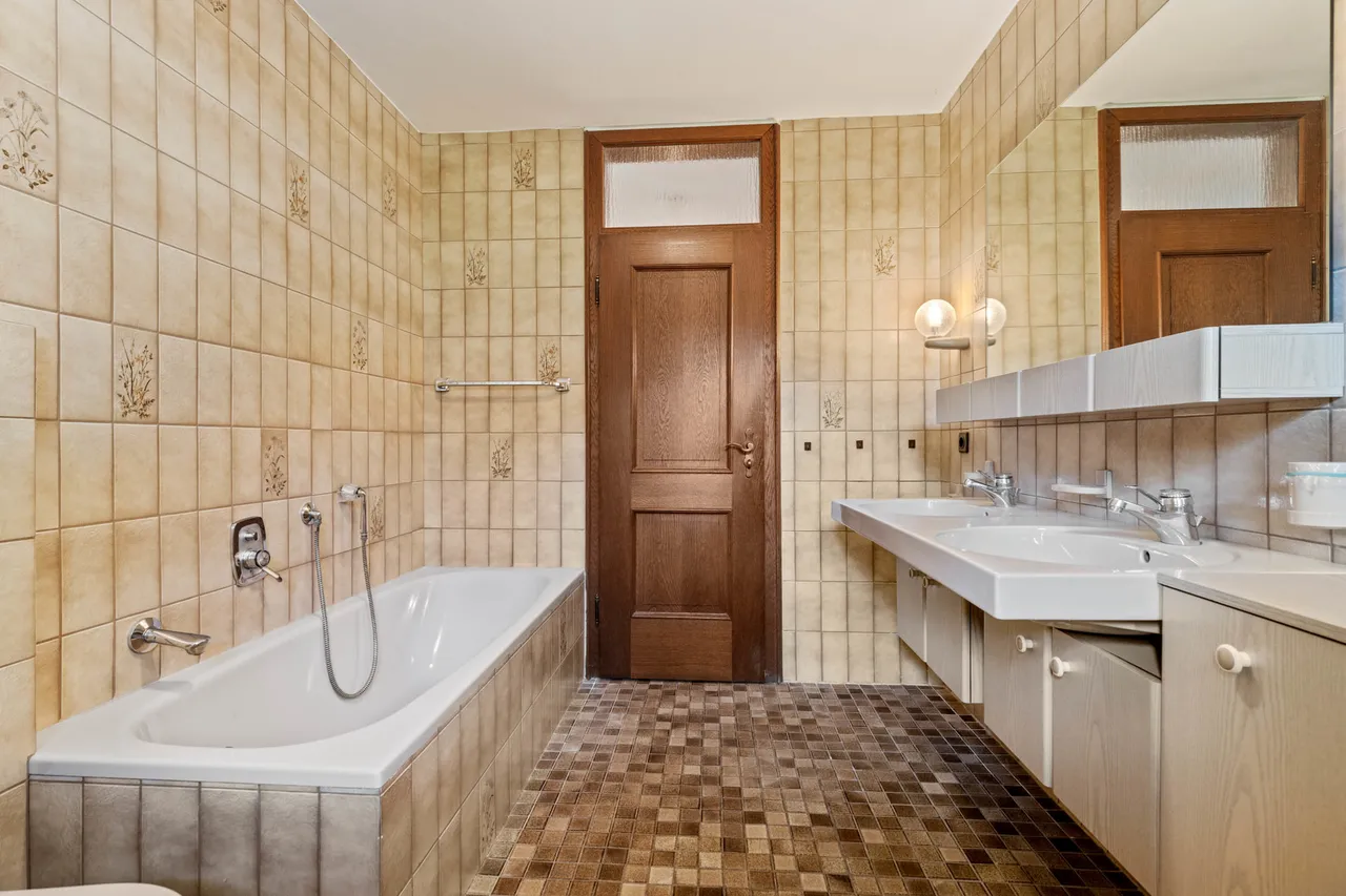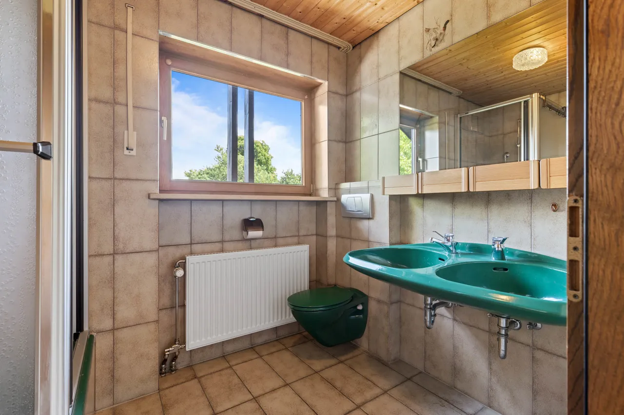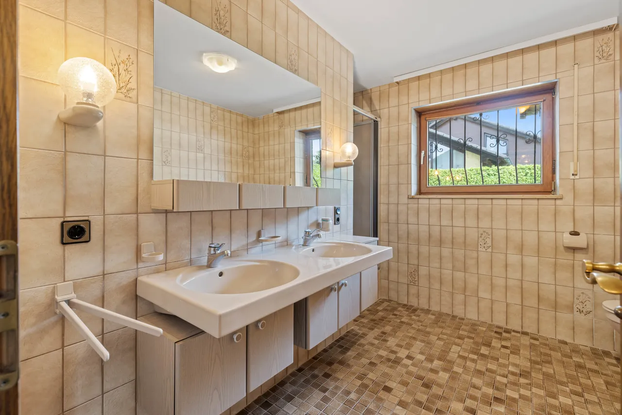 + Ein zweites Badezimmer im Dachgeschoss mit Dusche, WC, Doppel-Waschtisch und Fenster.