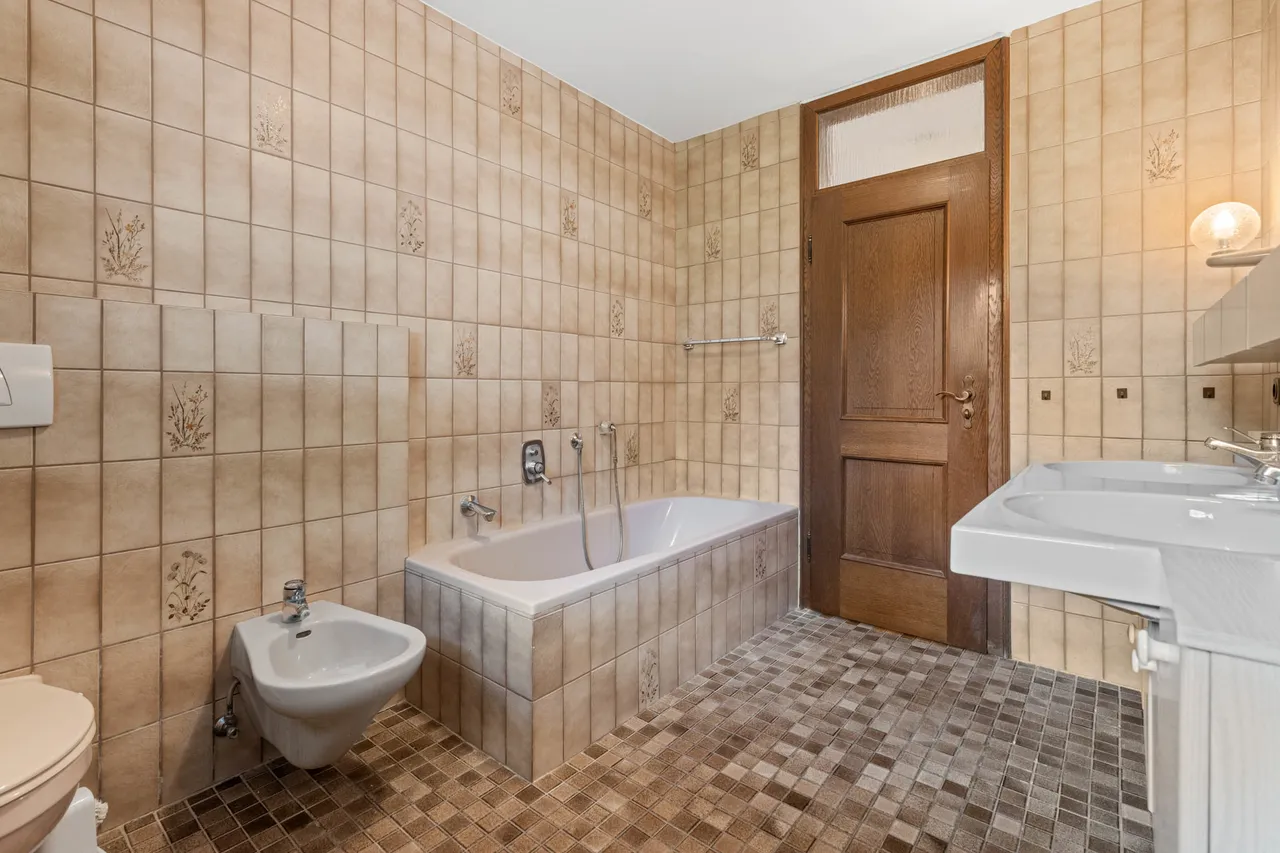 + Ein Badezimmer mit Badewanne, Dusche, WC, Bidet, Doppel-Waschtisch und Fenster.