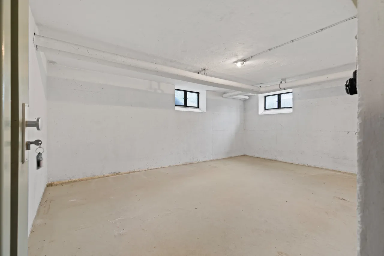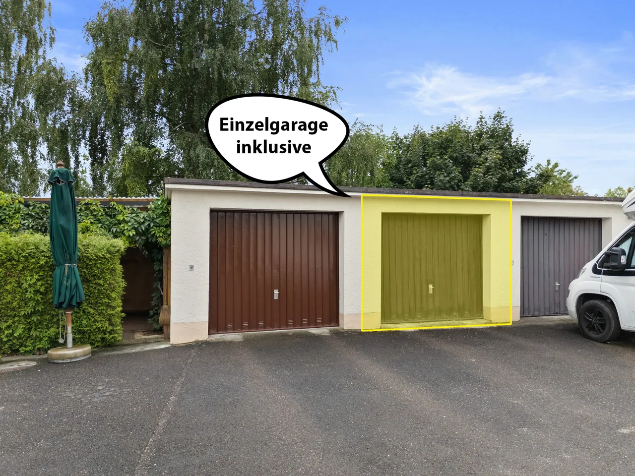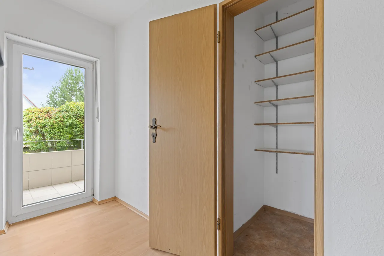 Zur Wohnung gehört zudem eine Einzelgarage und ein eigenes Kellerabteil. In der Wohnung selbst ist auch ein kleiner Abstellraum vorhanden. Im Außenbereich steht ein Gartenhaus zur Unterbringung von Fahrräder zur Verfügung.