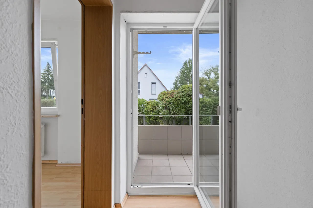 Der große und überdachte Balkon ist nach Westen ausgerichtet. Eine Treppe ermöglicht den direkten Zugang zu den Außenbereichen. Eine alleinige Gartennutzung ist nicht vorhanden.