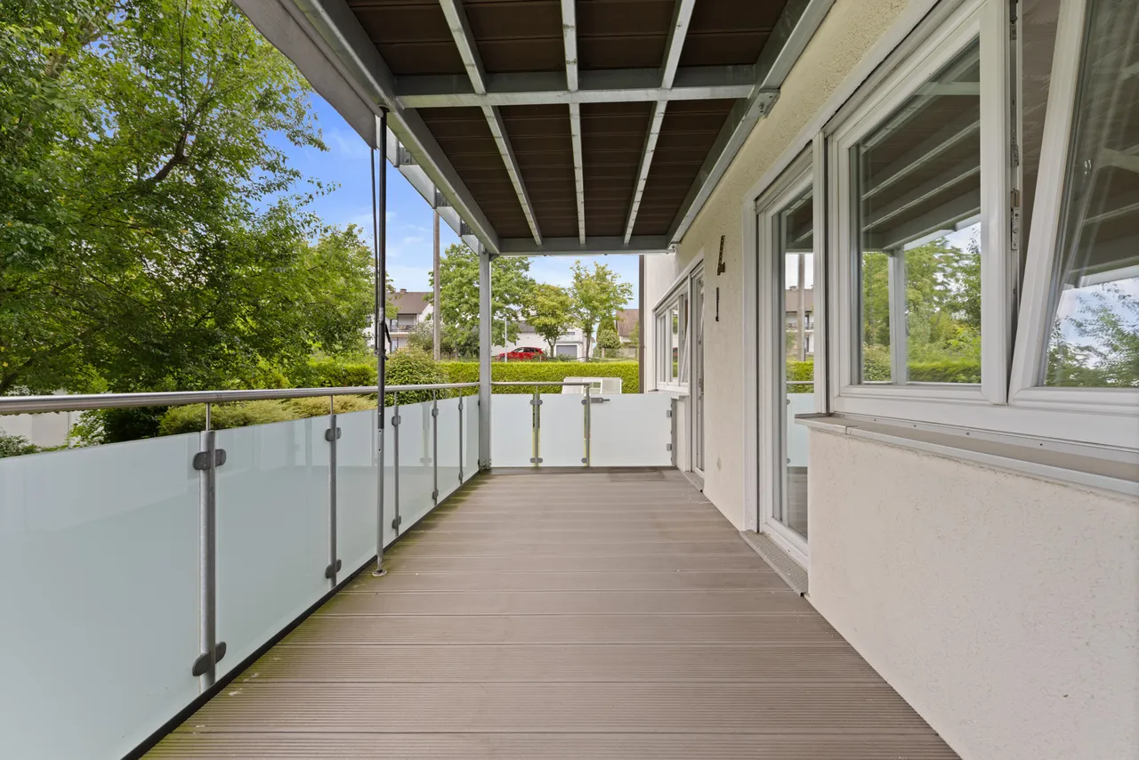 Der große und überdachte Balkon ist nach Westen ausgerichtet. Ein pflegeleichter WPC-Bodenbelag in Holzoptik ist vorhanden. Das Balkongeländer wurde aus satinierten Gläsern mit Edelstahlhandläufen gefertigt. Ein zweiter, kleiner Balkon ist zusätzlich auf der Ostseite vorhanden.