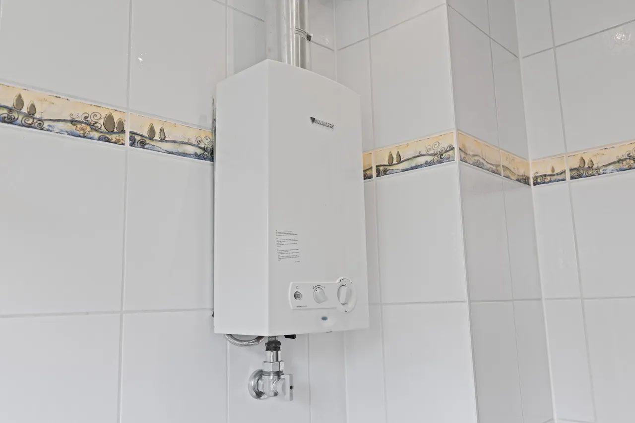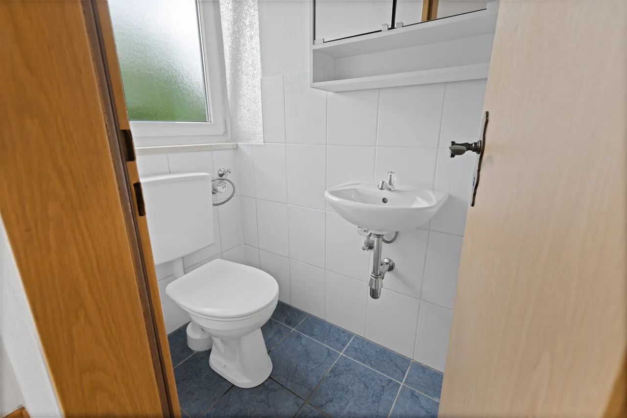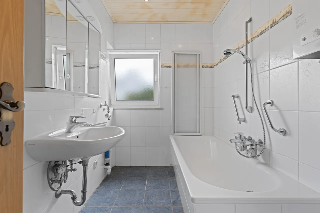 Das Badezimmer ist raumhoch weiß gefliest, eine Badewanne mit Duschabtrennung ist vorhanden, ebenso ein Waschmaschinenanschluss. Für Tageslicht und gute Belüftungsmöglichkeiten sorgt ein Fenster mit Sichtschutzverglasung. Das WC befindet sich separat außerhalb des Badezimmers. Im Badezimmer ist ein Gas-Durchlauferhitzer zur Erzeugung des Warmwasser installiert.