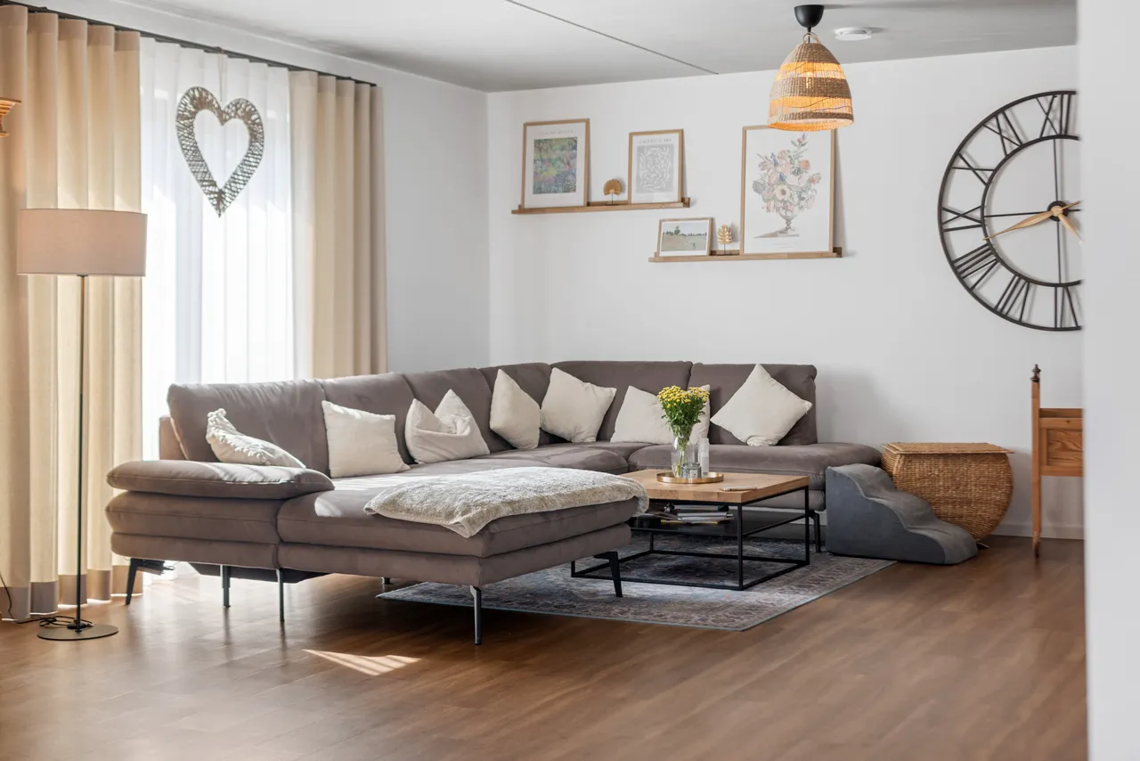 + In den Wohn- und Schlafräumen sind pflegeleichte Vinyl-Designboden in Eiche-Optik verlegt, ebenso in den meisten Kellerräumen.