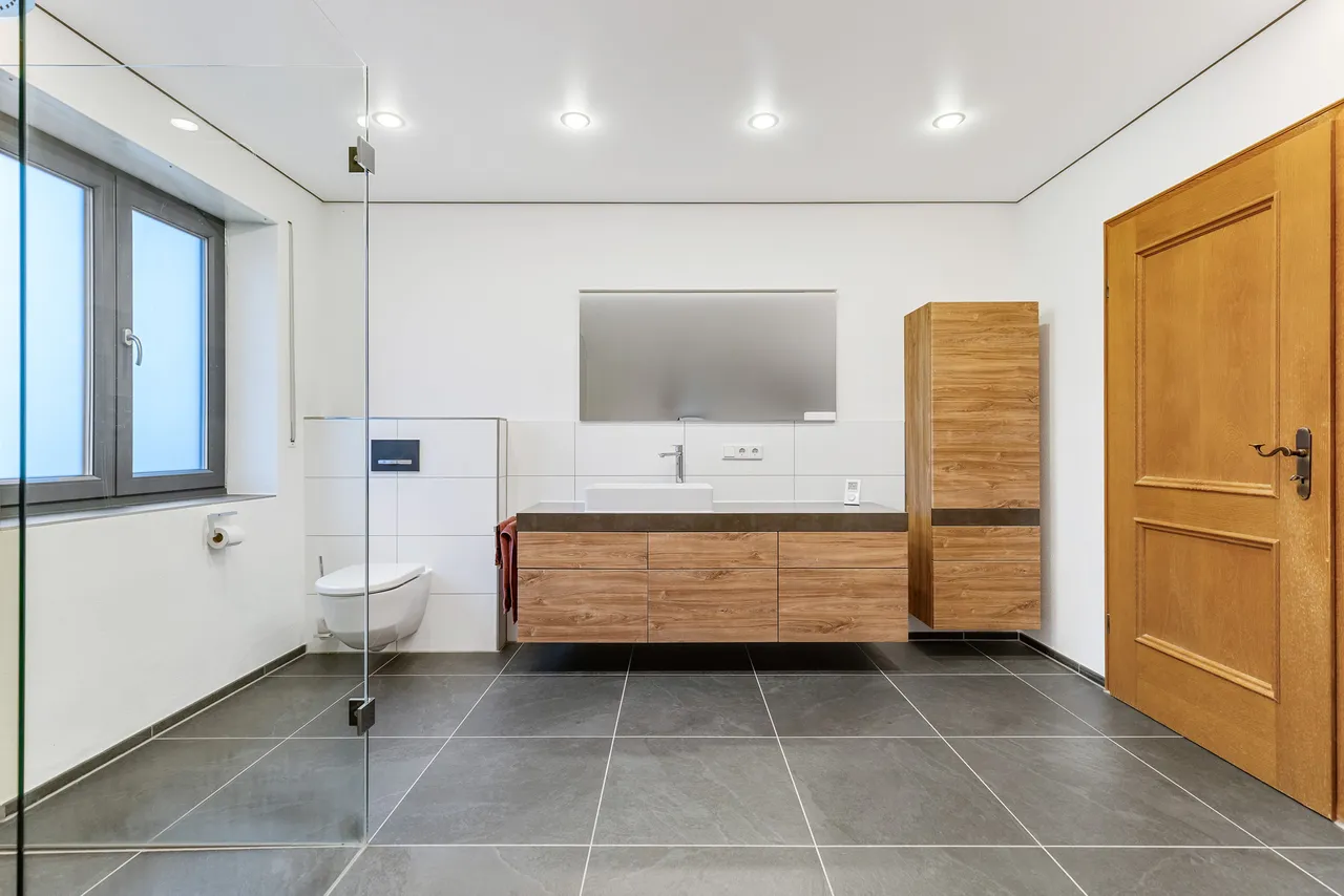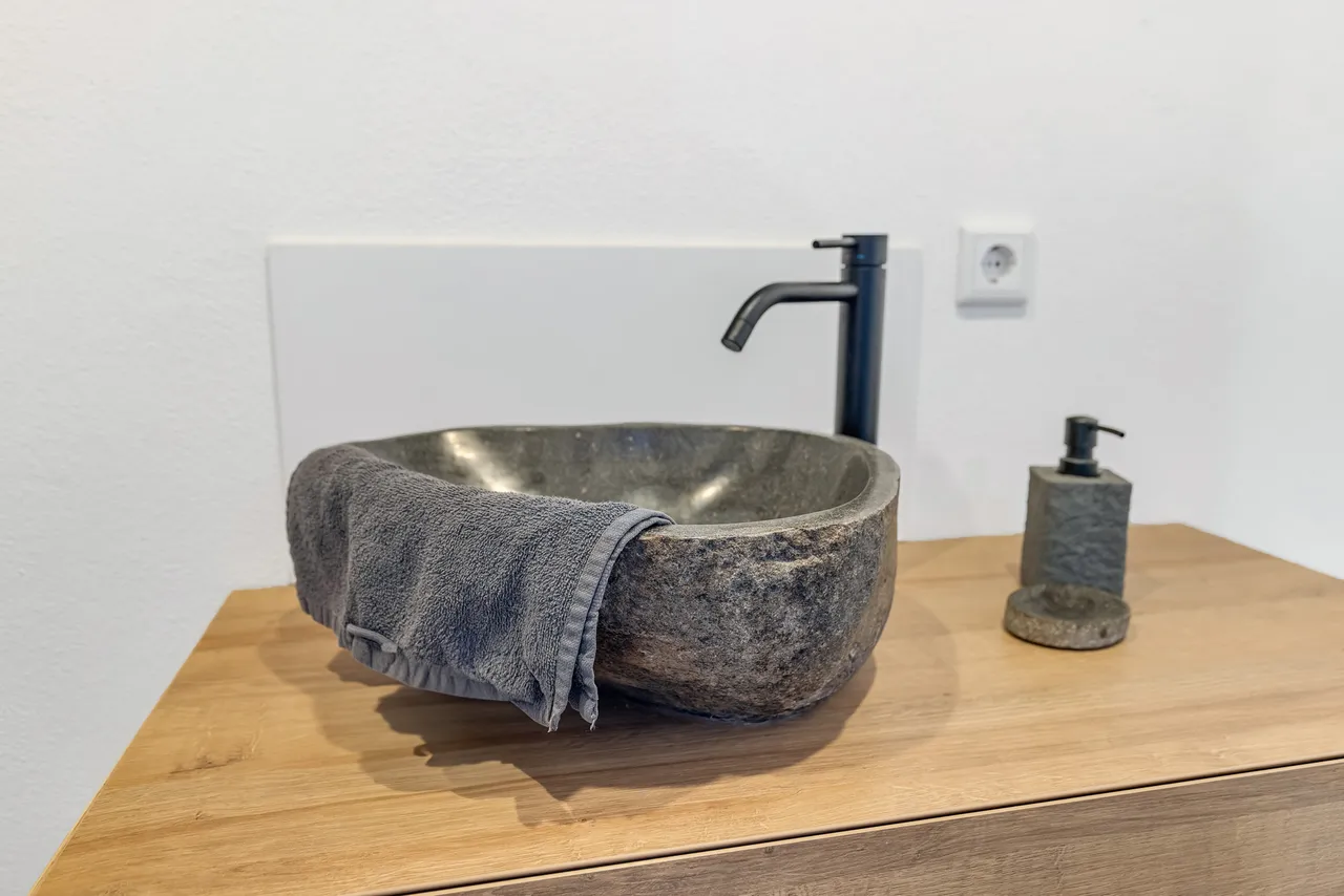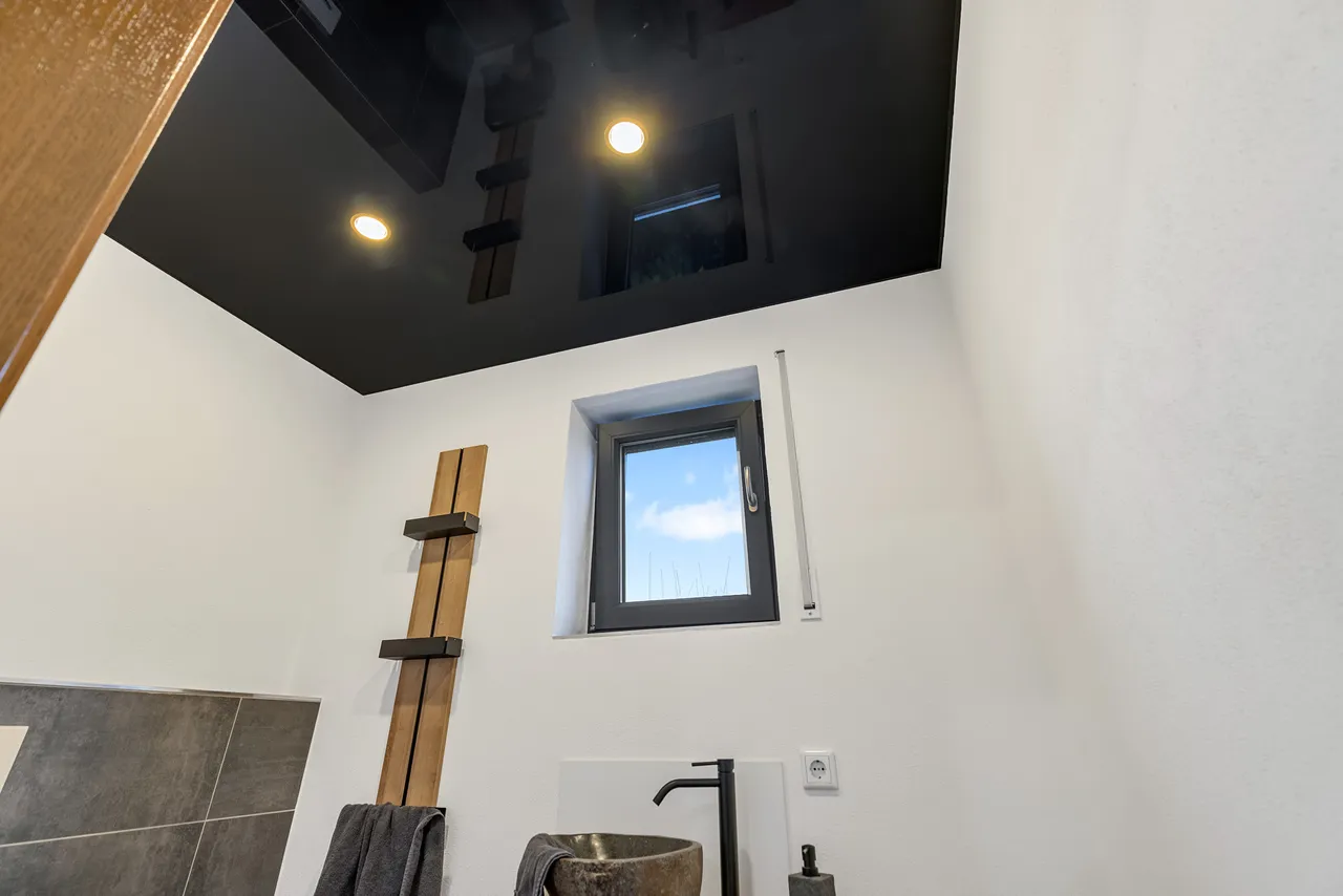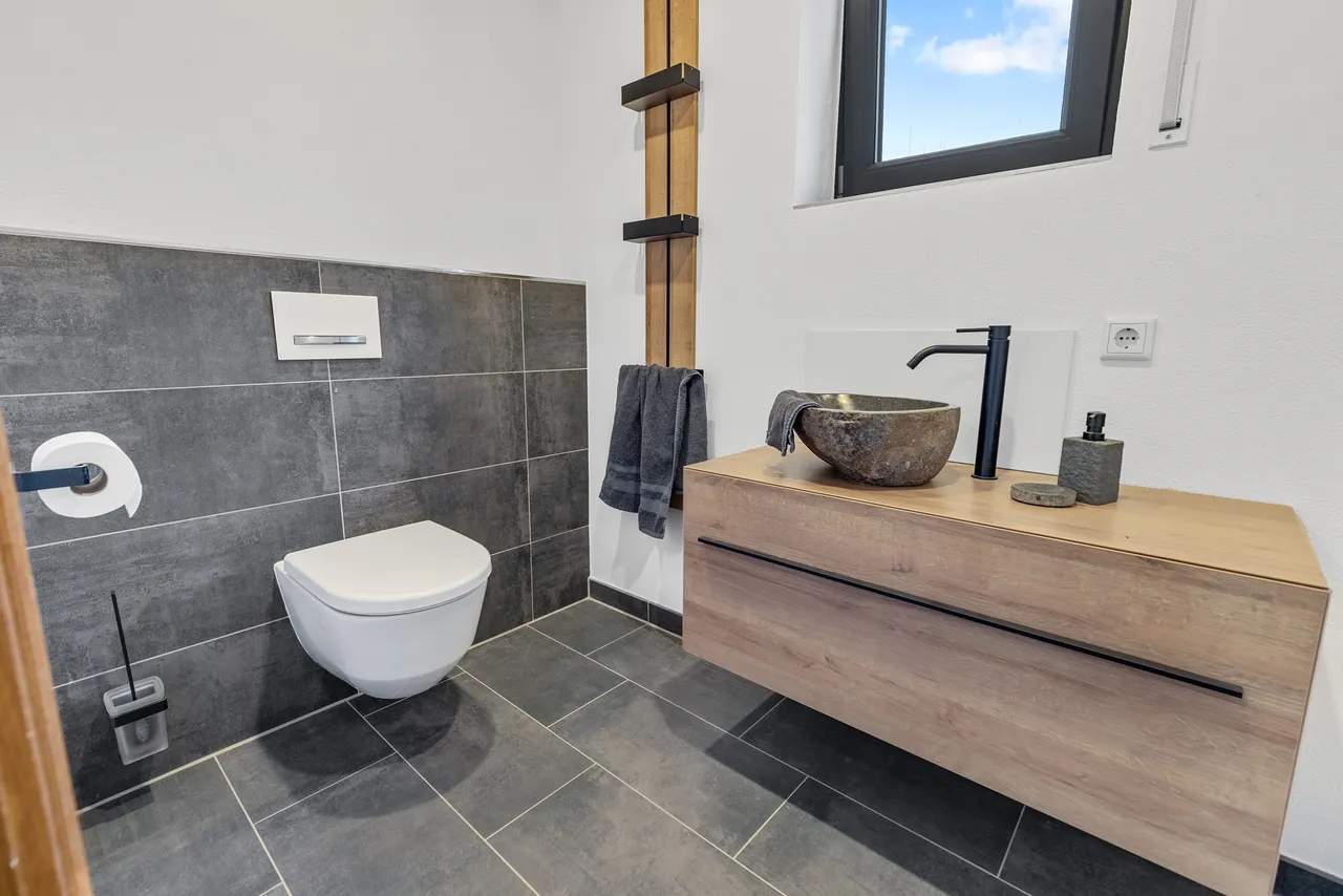 + Das neue Gäste-WC verfügt über eine hochwertige Innenausstattung (Stein-Aufsatz-Waschbecken, Lackspanndecke etc.). Ein Fenster ist vorhanden.