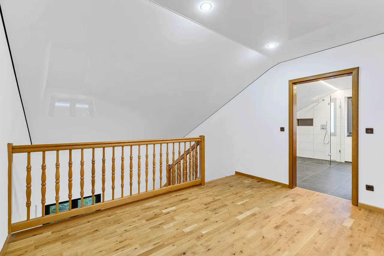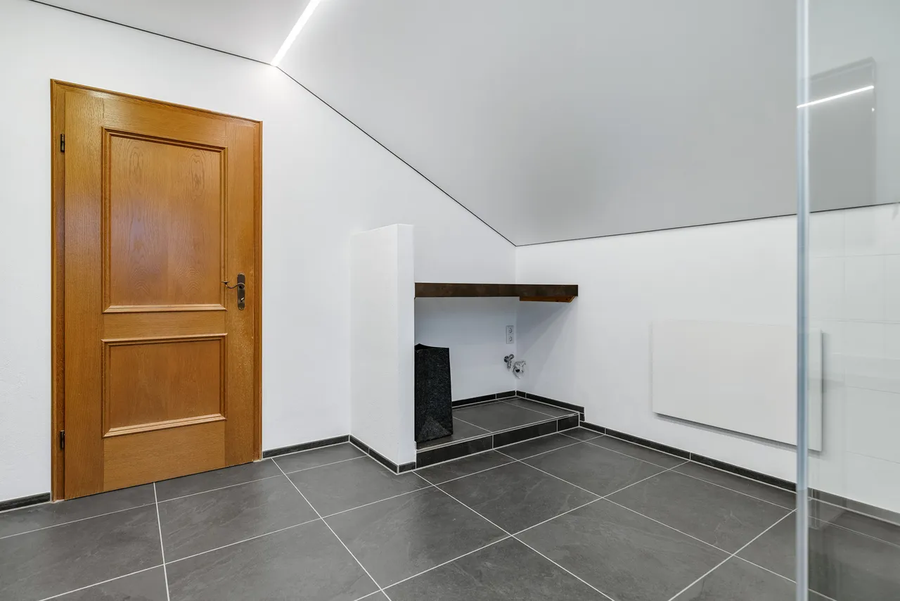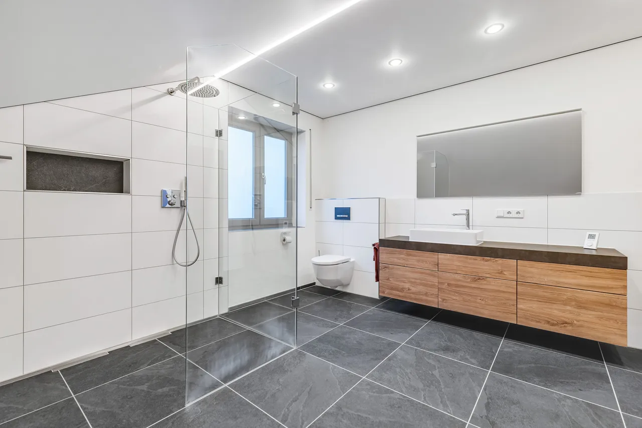 Das neue Badezimmer im Dachgeschoss überzeugt durch eine großzügige begehbare Dusche, einen ebenso großzügigen Waschtisch und die Möglichkeit, eine Waschmaschine direkt im Badezimmer anzuschließen. Ein Fenster ist vorhanden. Das Highlight bildet eine glänzende Lackspanndecke in der Farbe Weiß mit Schattenfuge und integrierten Beleuchtungselementen.