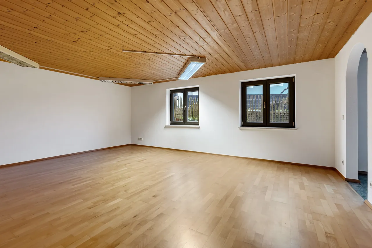 Das in Massivbauweise errichtete Gebäude ist voll unterkellert. Die Kellerräume verfügen dank der leichten Hanglage des Grundstücks über viel Tageslicht und lassen eine hochwertige Nutzung zu. Ein ebenerdiger, separater Zugang auf der Gebäuderückseite (Nord) ist gegebenen. Die Räumlichkeiten sind überwiegend hochwertig ausgestattet, inklusive einem zweiten Badezimmer, einem Küchenbereich und attraktiven Bodenbelägen / Fenstern etc.