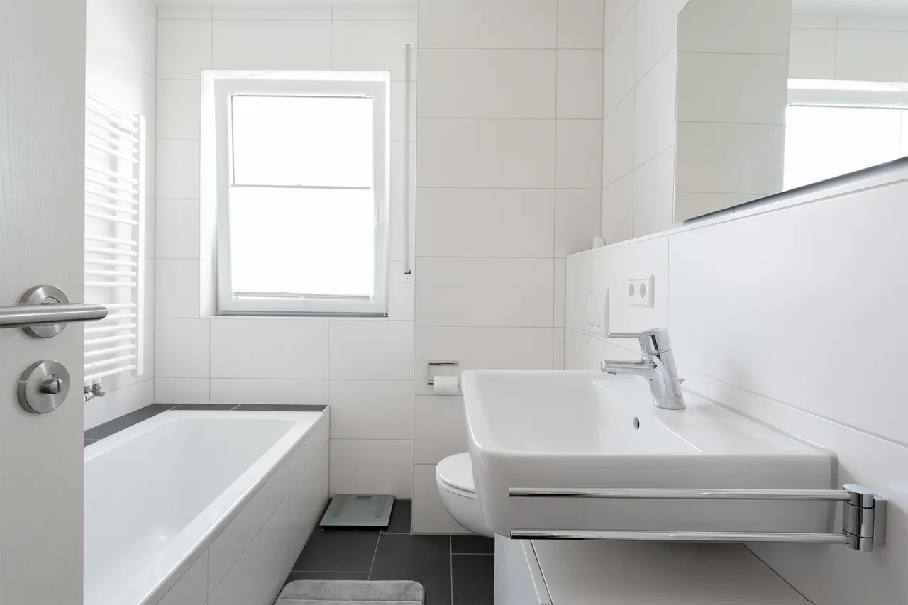 Das Bad ist zudem raumhoch in weiß gefliest und ist neben der Badewanne mit einer Dusche mit Klarglaskabine ausgestattet. Das Gäste-WC ist ebenfalls weiß gefliest (halbhoch).